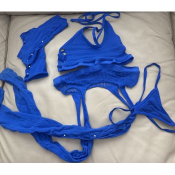 Blue see through lingerie set (g string, bra, leggings, gloves)