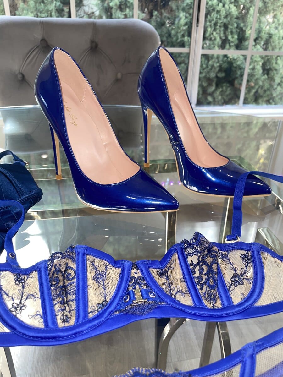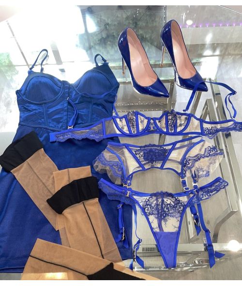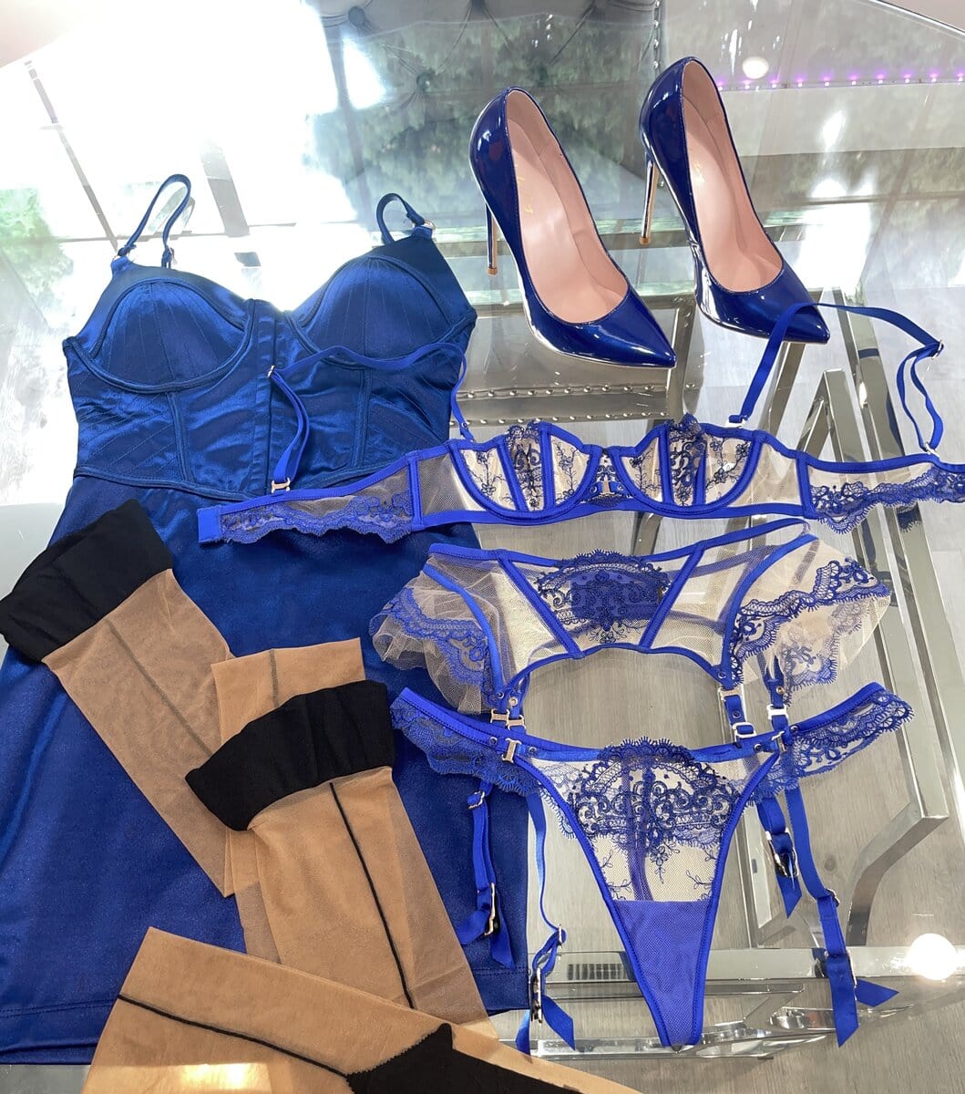 This set has been highly sought after by fans and I’m finally willing to part with it. You’ll receive the Satin Dress, Bra+Garter Belt+ Panties , the thigh highs + Blue Heels!