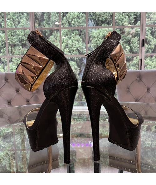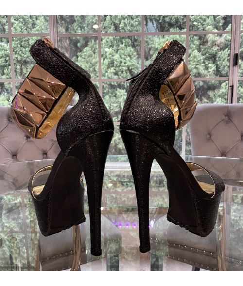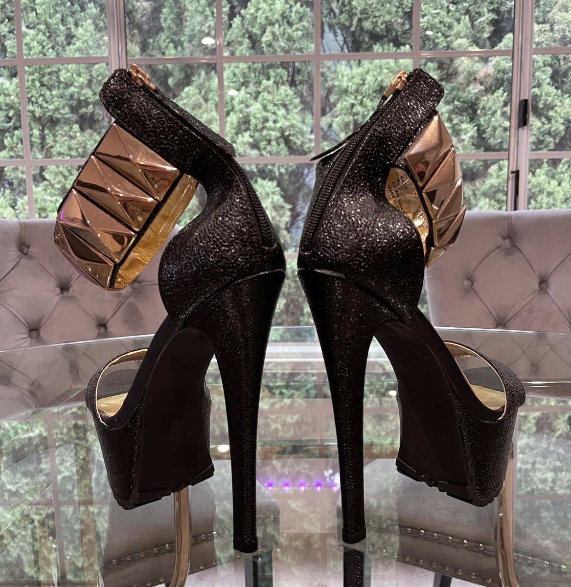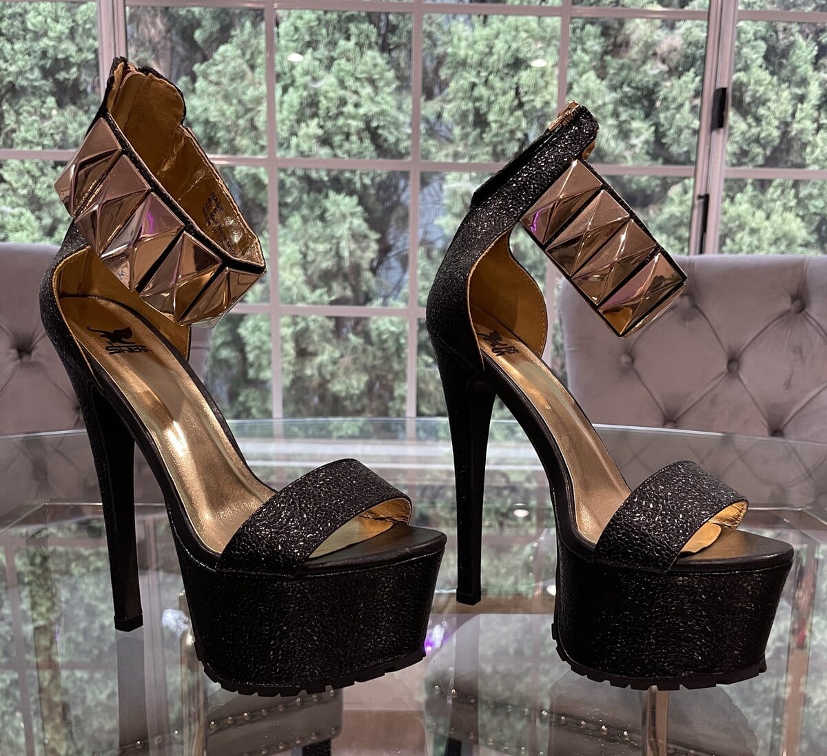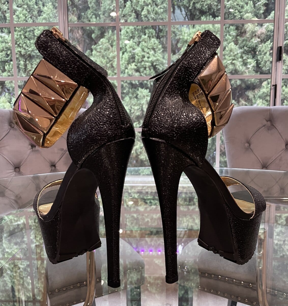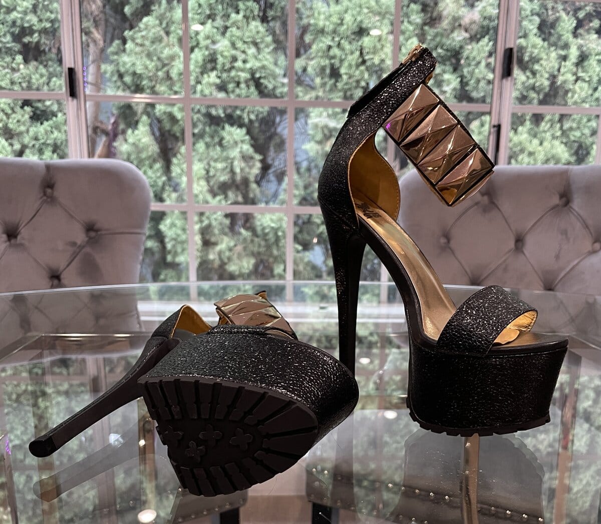 Charlotte Stokely’s Destructive Black Stilettos with Gold Strap