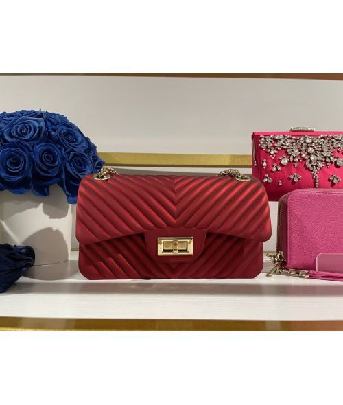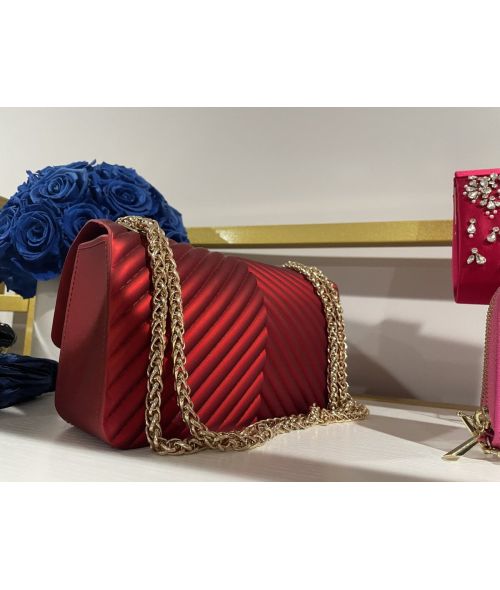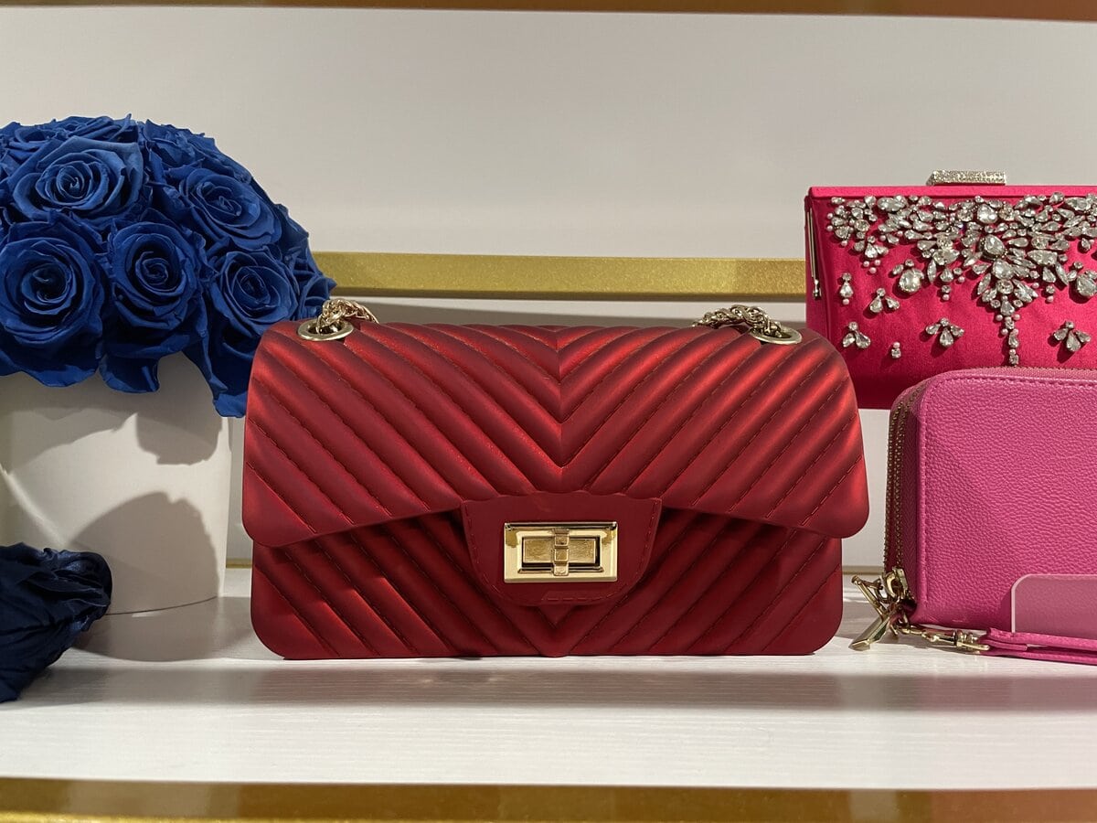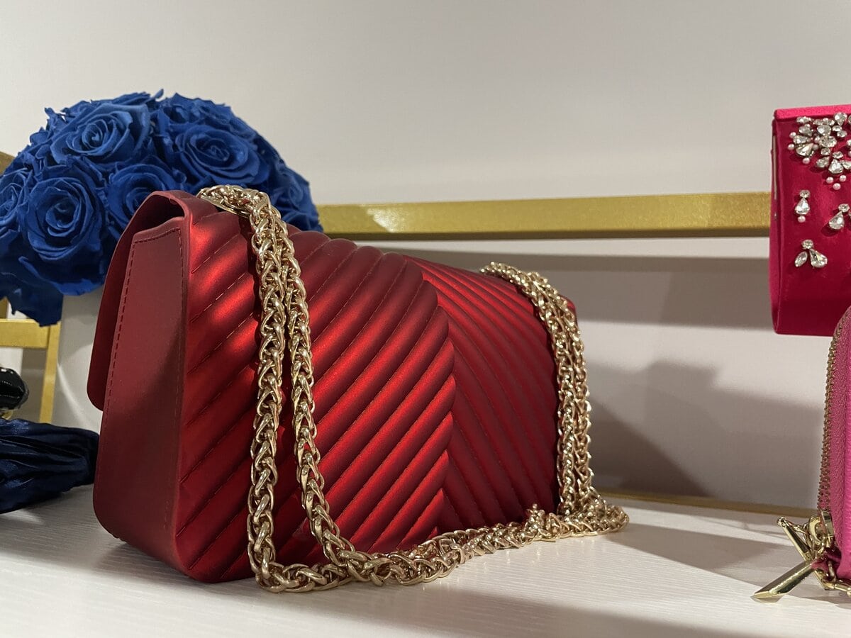 Charlotte Stokely’s Reflective Red Purse with Gold Chains