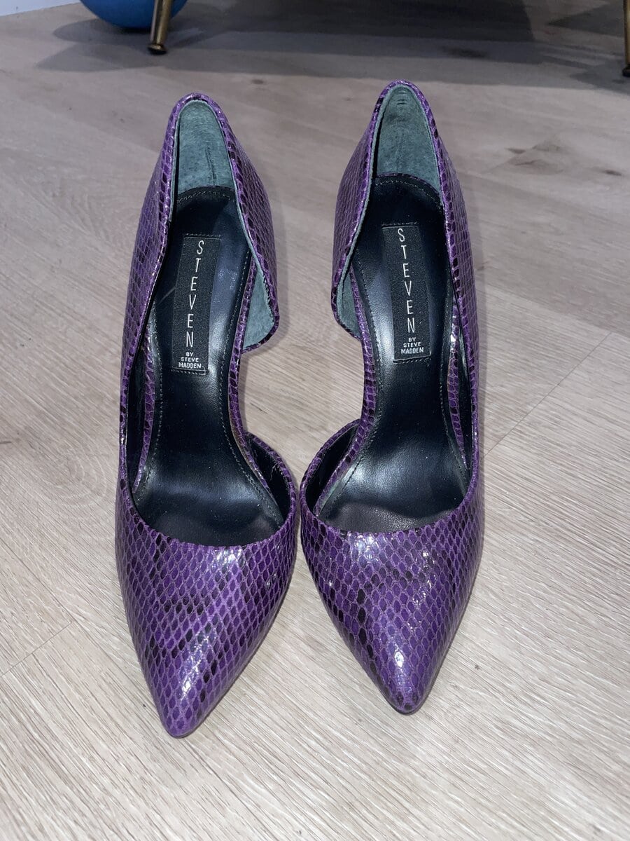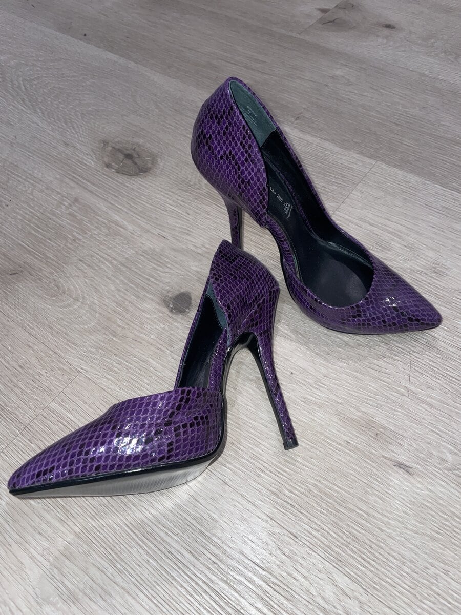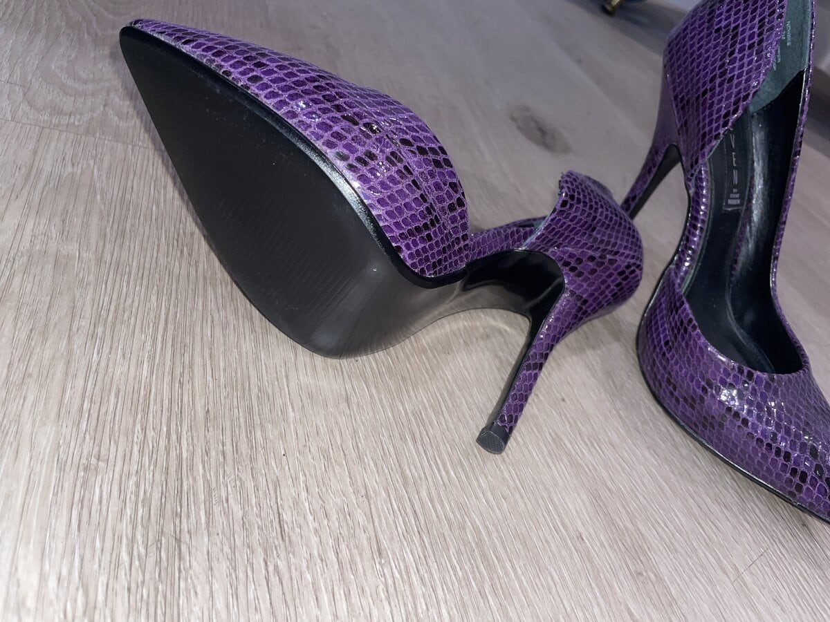 I love this royal purple lingerie set especially over my pale skin, I’ve worn it many times, the Purple Snake Skin Heels have a lovely arch and a pointed toe. Includes the nude thigh highs as well!