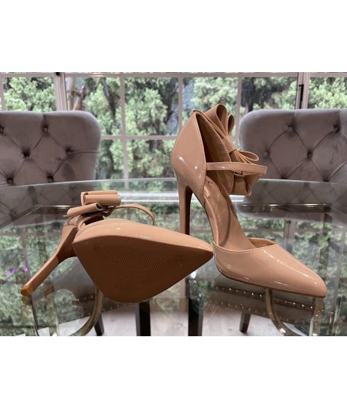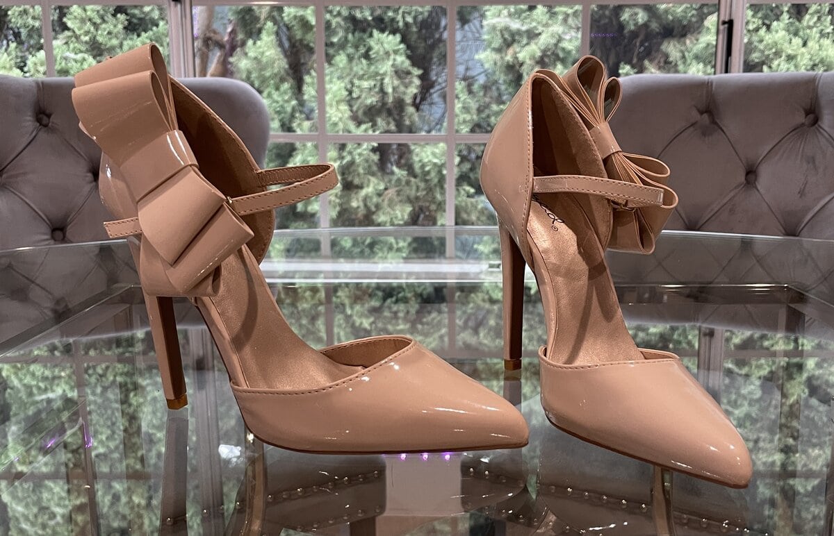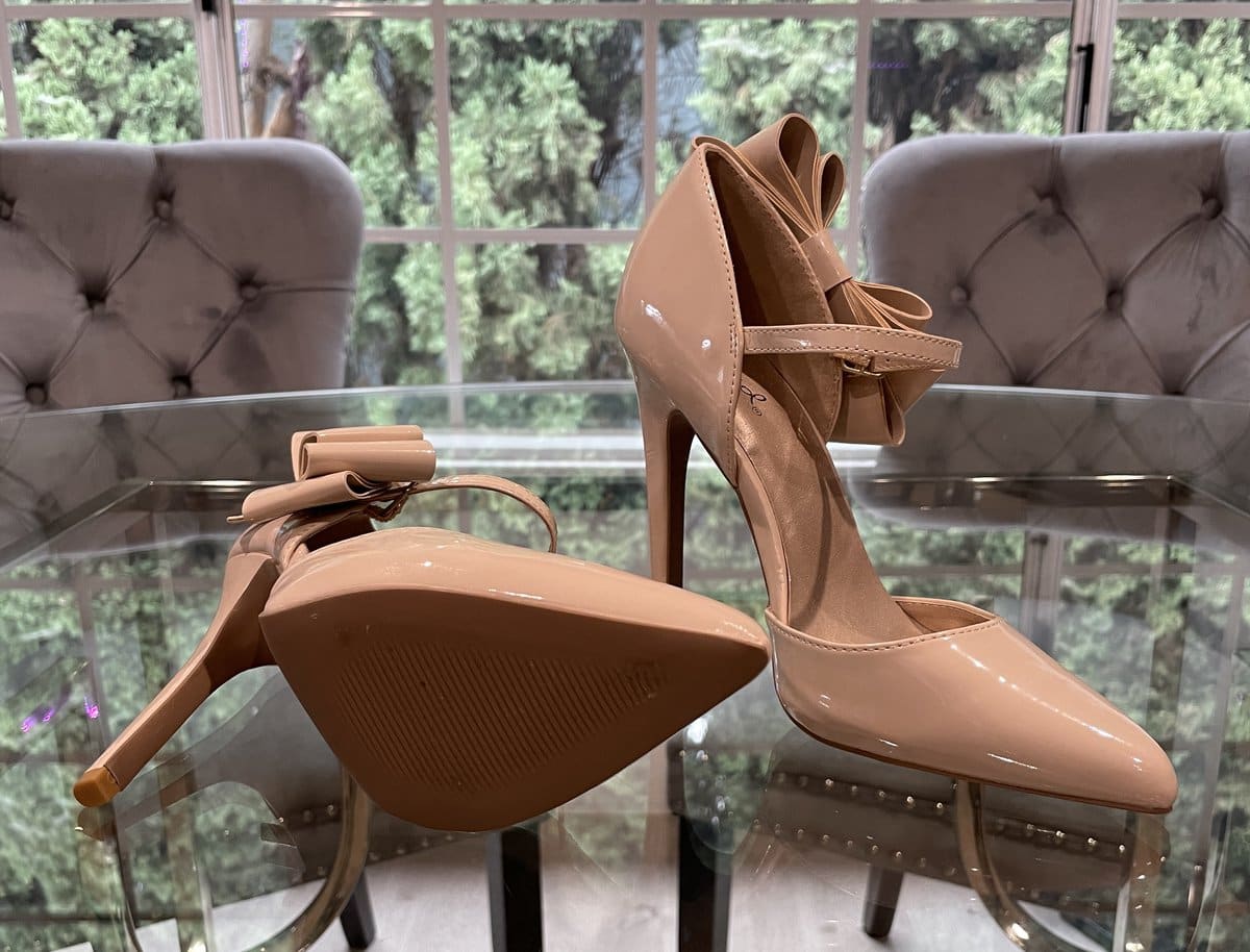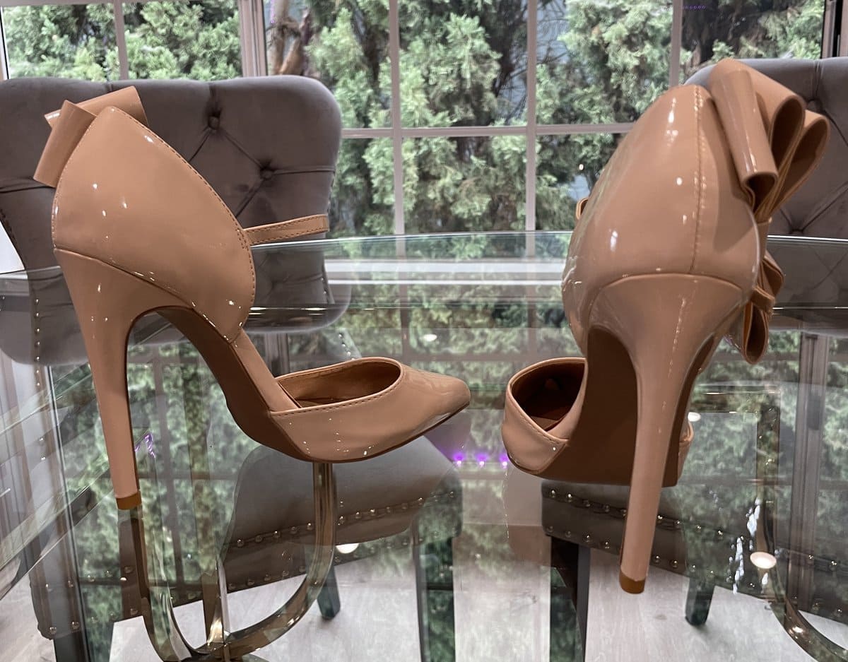 My Shiny, Nude, Pointed Toe, High Arch, Stilettos with Bows as seen in my movies. Sole is smooth so if you’d like me to autograph with metallic sharpie let me know. xoxo