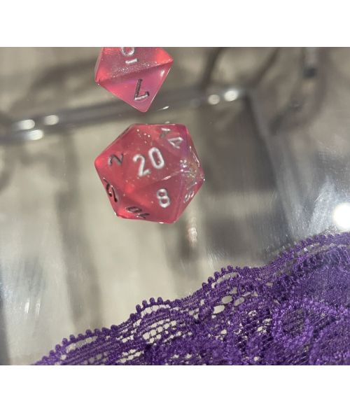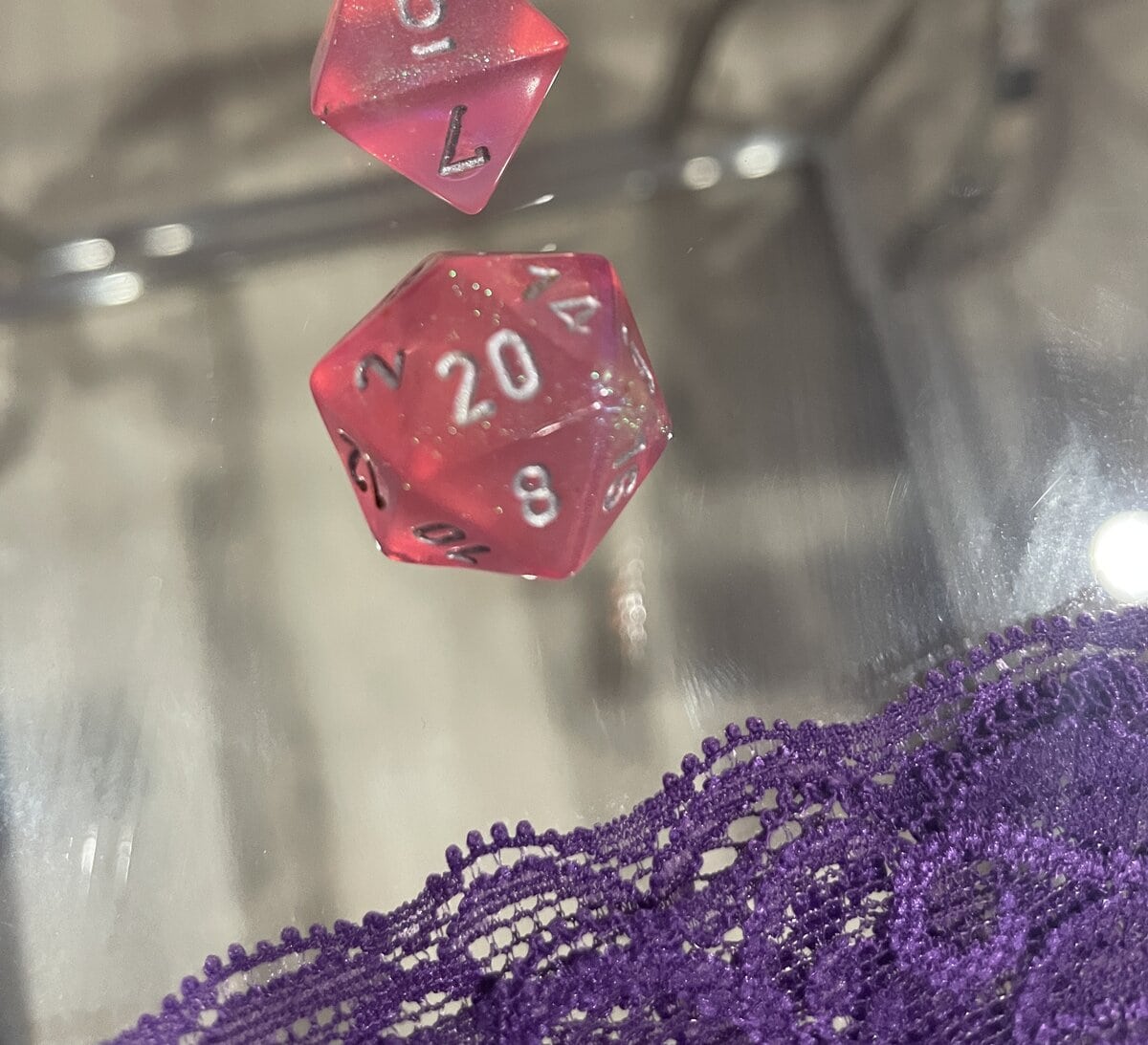 You’ll also receive a purple thong that will smell like me and be worn before I mail to you in a Ziploc Bag and a set of LUCKY DICE! I’ve played with this dice set for over 9 years in tabletop games. A true personal item of mine to own.