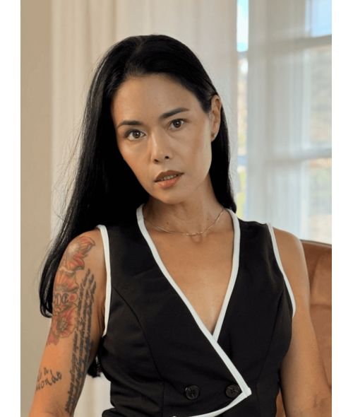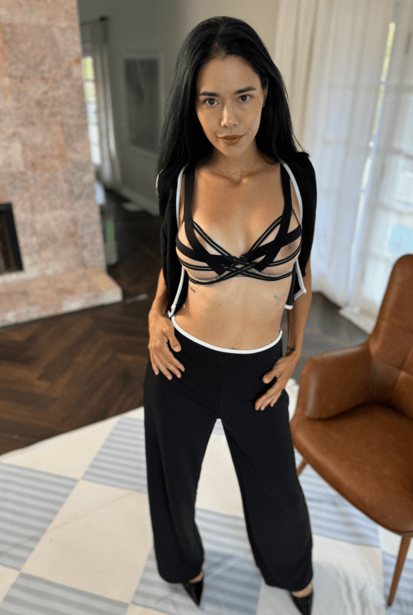 All my Dana Vespoli fans, we've got a new bundle of goodies from her available to you (so keep your eyes peeled)! This is her Black Top and Slacks set, worn here. Does not include bra featured in the second pic, but just the top and bottom wardrobe.