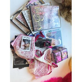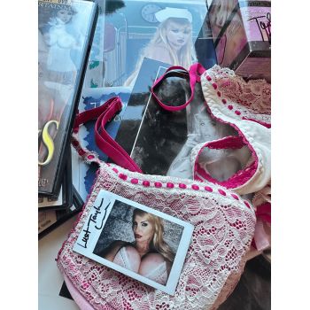 Off white lace bra with Pink detail and trim, matching thongs and collectibles.