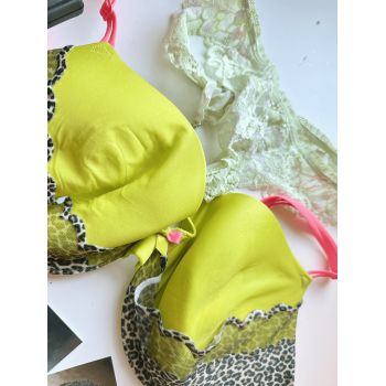 Lime Green and Salmon detail bra 36DD, with green lace panties, plus collectibles