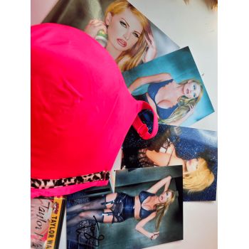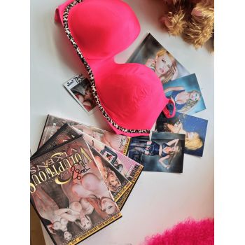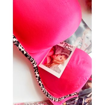 Salmon Pink pushup Bra with leopard trim 36DD, polaroid and collectibles.