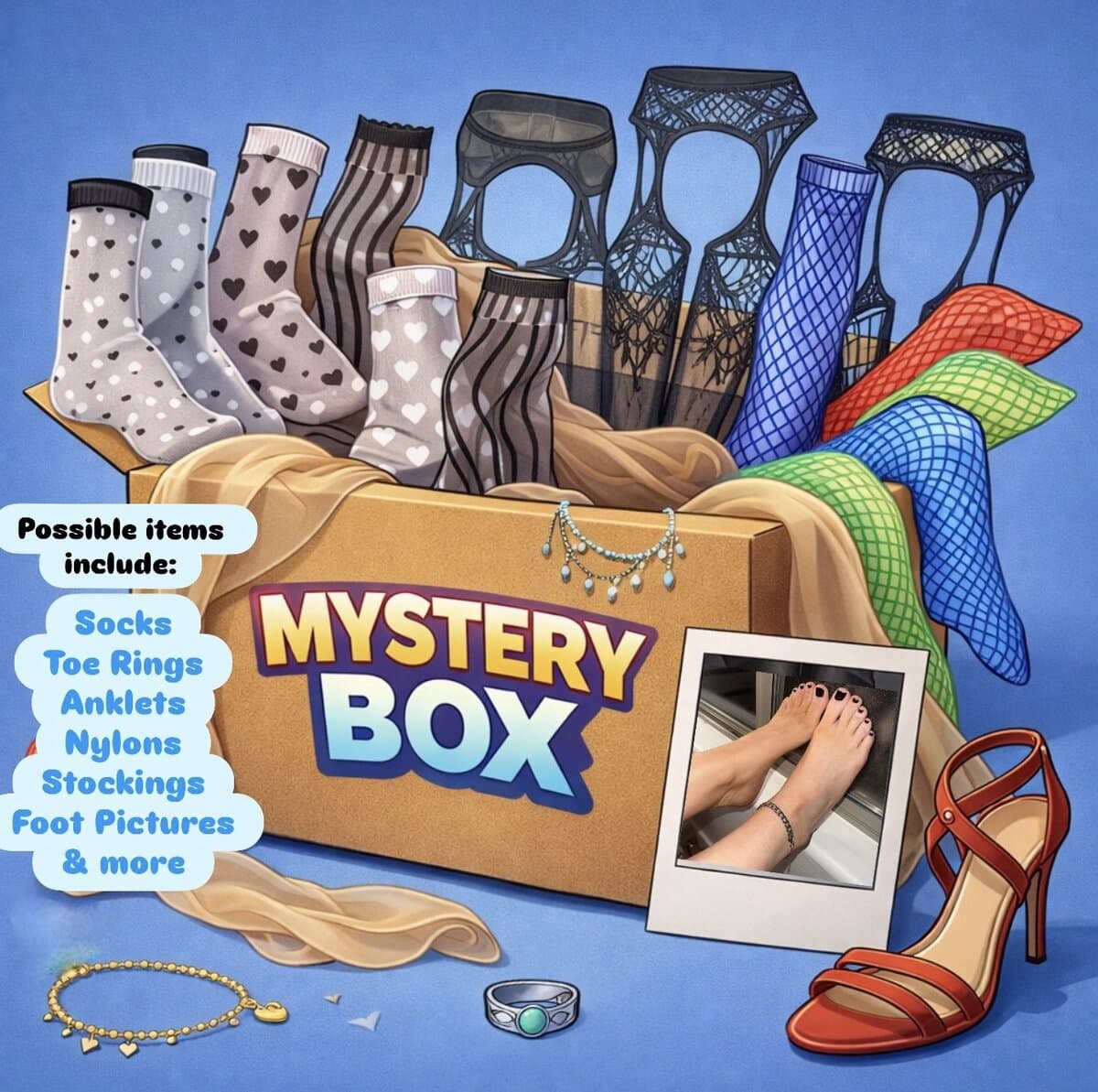 Every box is completely different and unique! Could contain: Socks, Toe Ring, Anklet, Nylons, Stockings or anything else that I might have that I know you will LOVE! <3