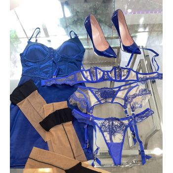 Charlotte Stokely’s Blue Honey Birdette Lingerie Set + Thigh Highs + Heels + Blue Satin Dress Worn on BoxCover & in scene w/ Lacy Lennon