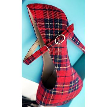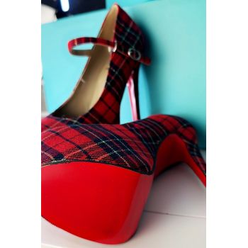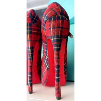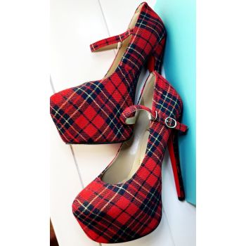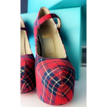 Gorgeous red bottom platform stilettos with strap. Tartan print.