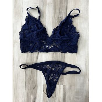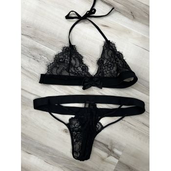 Worn Used Black Lace and Stin Bra and Thong Panty Set