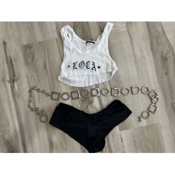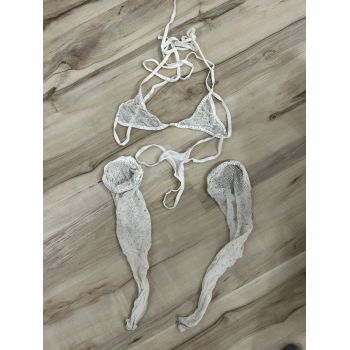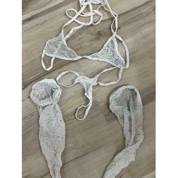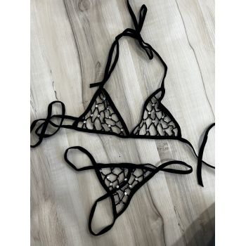 Worn Used Black Fishnet Rhinestone Bikini Set