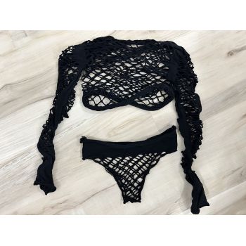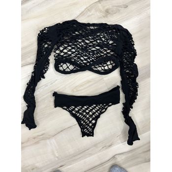 Worn Used Black Large Diamond Fishnet Long Sleeve Top and Panty Set