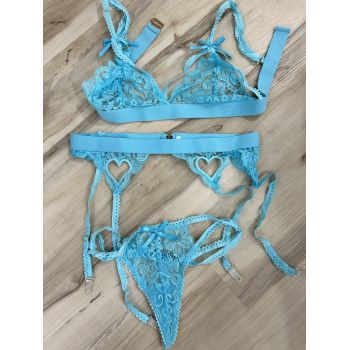 Worn Used Baby Blue Lace Bra, Garter Belt and Panty Set