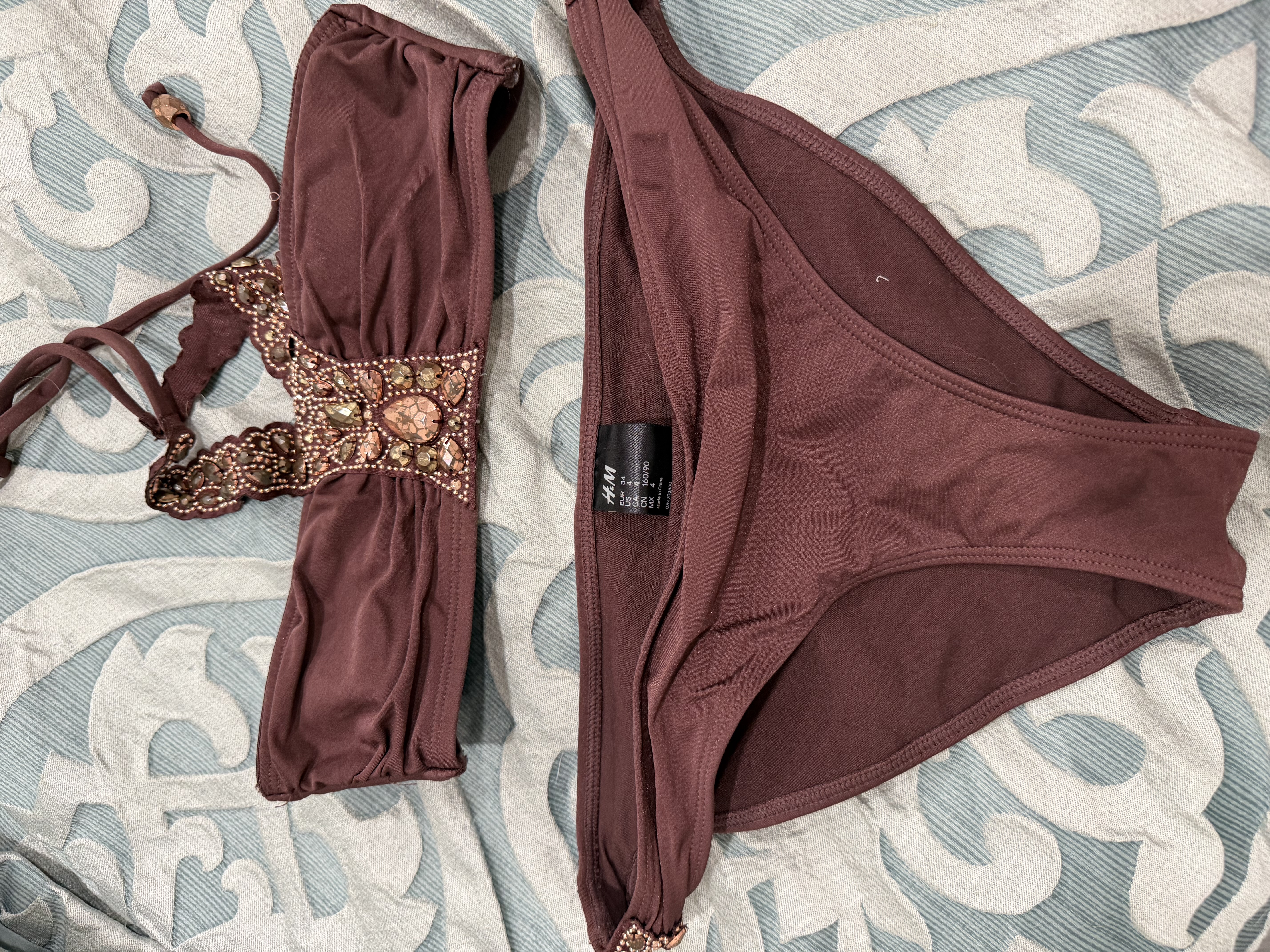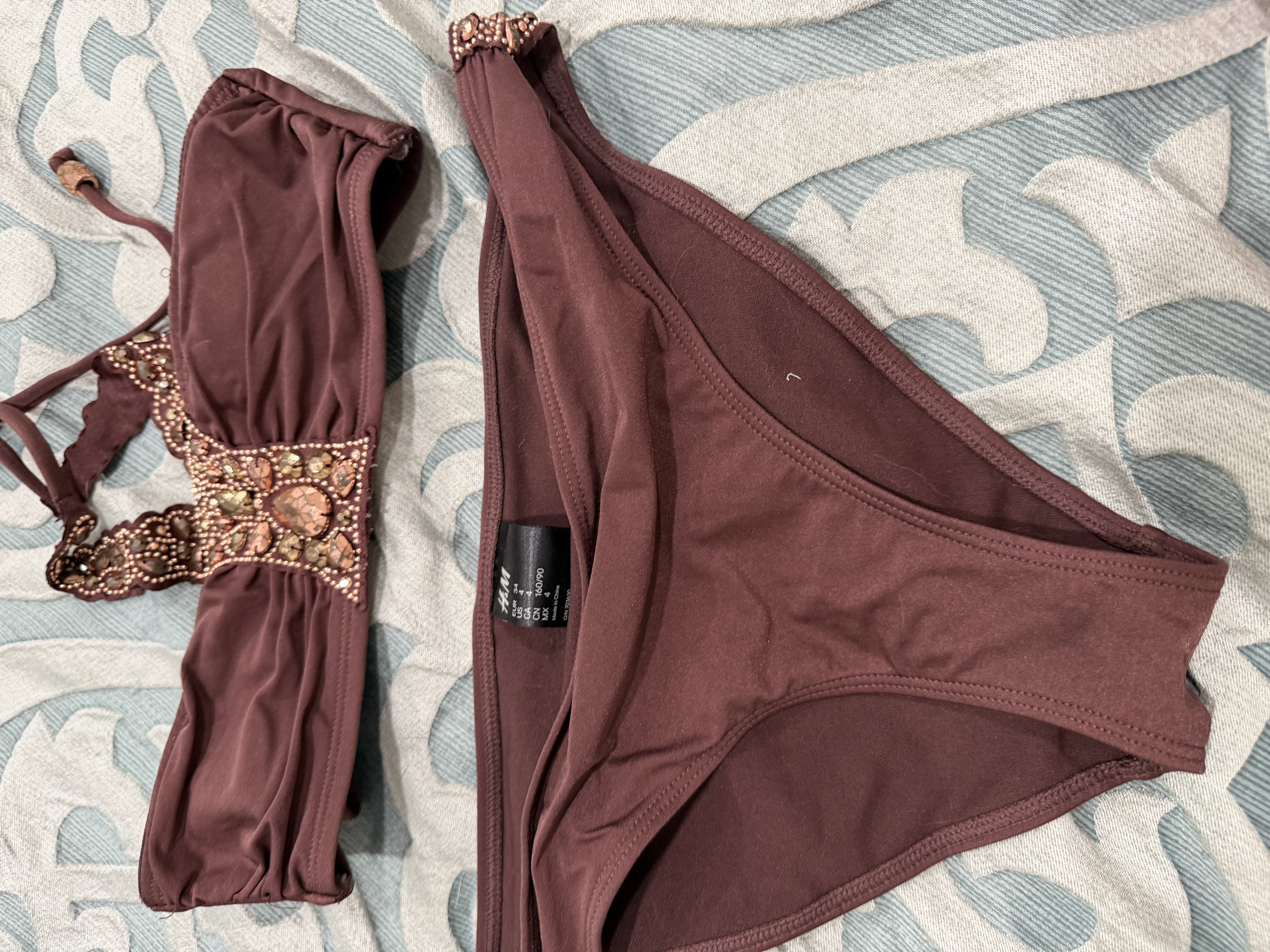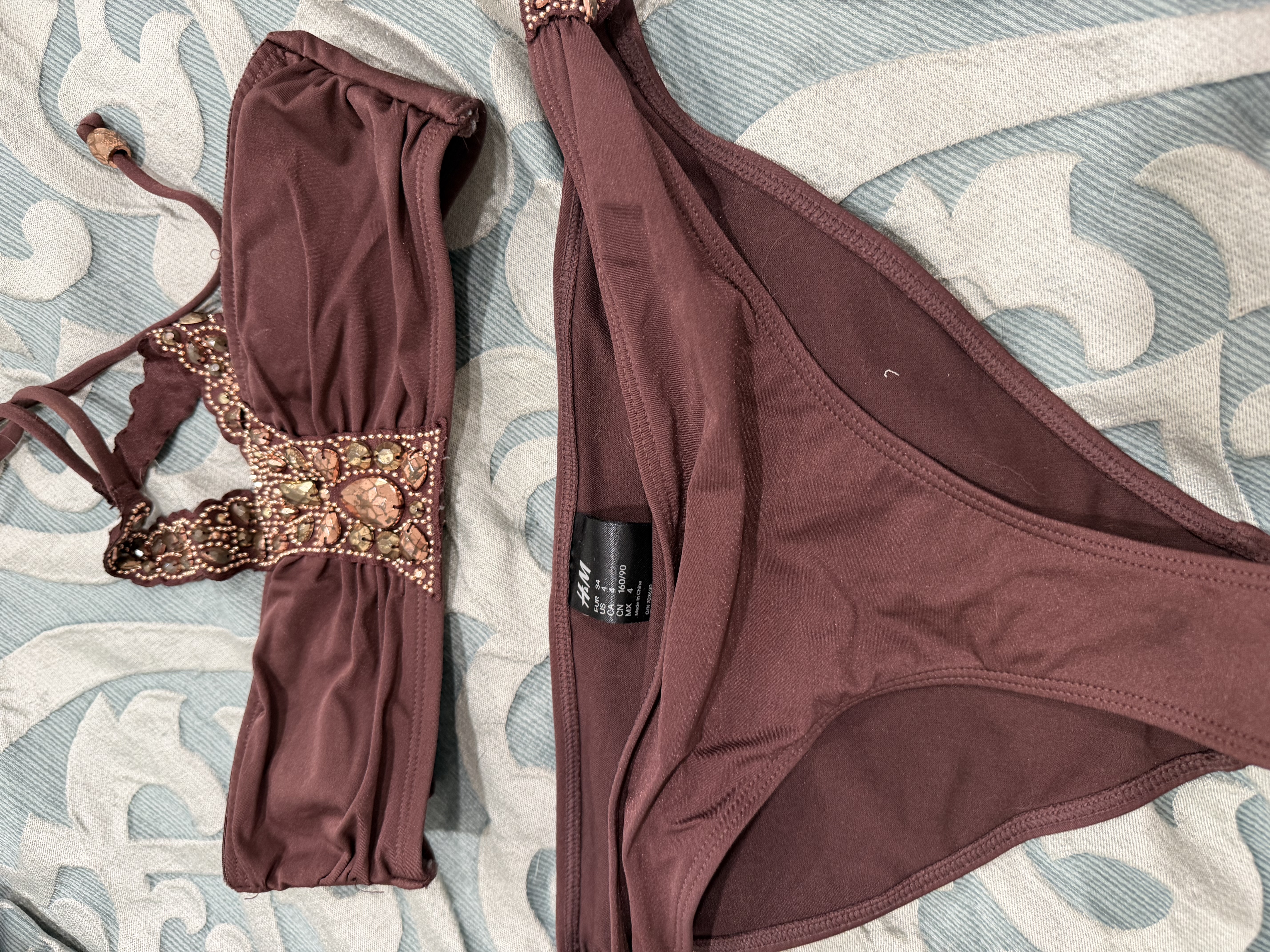 Hey you dirty boys… this skimpy brown one-piece swimsuit hugged every curve of my tight body all day in Waikiki. The shiny jewels sparkle right over my nipples and barely cover my smooth, tanned pussy. It’s been soaked in ocean water, sweat, and my sweet juices – still has that warm, musky scent of me. Perfect for wrapping around your cock while you jerk off thinking about me wearing it. Lightly stained, heavily used, and ready for your filthy fantasies. One-of-a-kind worn treasure.