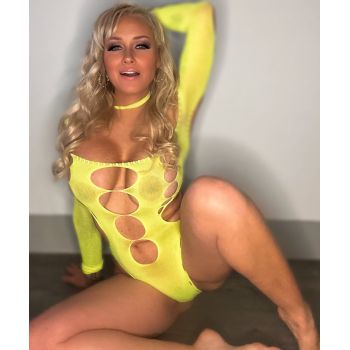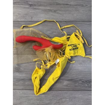 Sophie Dee sexy yellow bikini + red vibrator toy