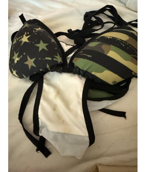 This listing is for her stained, camo/USA flag bikini set (seen pictured). Bundle and save!