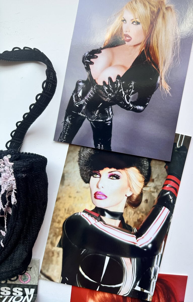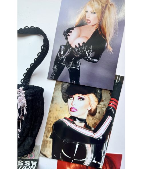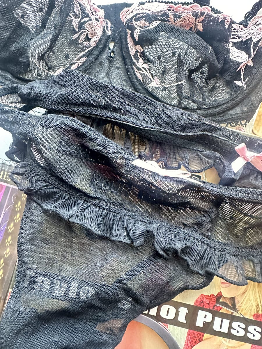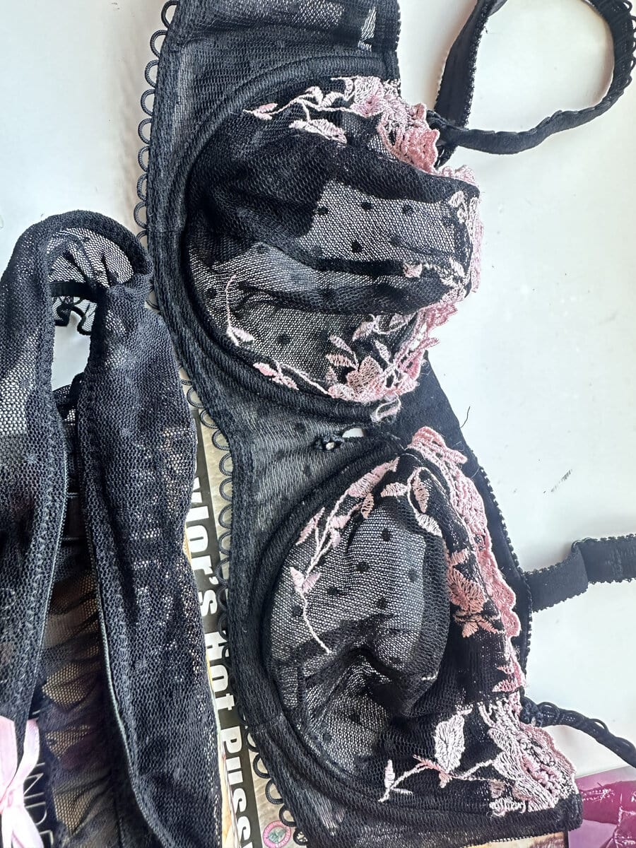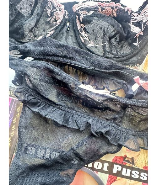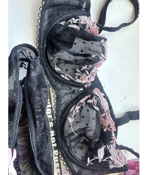 Sexy lace bra with pink trim, black panties with a garter attached. 4 DVDs, three color photos, and Vibrating pussy.
