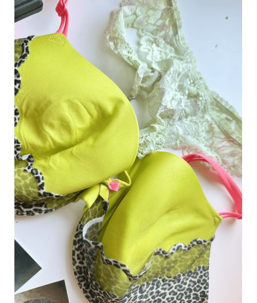 Gorgeous lime green push-up bra 36DD, with lace thong lime green panties. Im including bonus extras. 3 -5x7 color photos, 4 DVDS, a Polaroid of me wearing the bra,