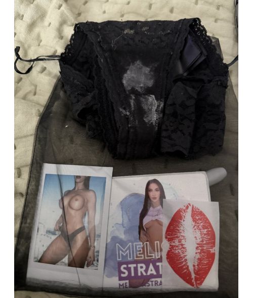 Each pouch comes with a VERY worn panty, a signed polaroid of her wearing the panty, a personalized Melissa Stratton sharpie, and two stickers. This is a great little fan or gift item. Each pouch has a UNIQUE panty (of different colors are styles), buy multiple pouches and save, or buy for friends and gift to all your Melissa Stratton fan friends! Let Melissa personalize for you.