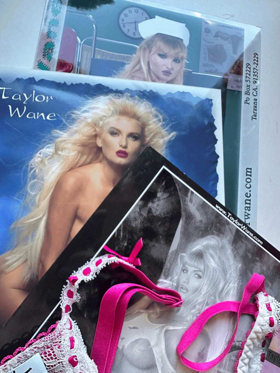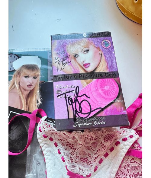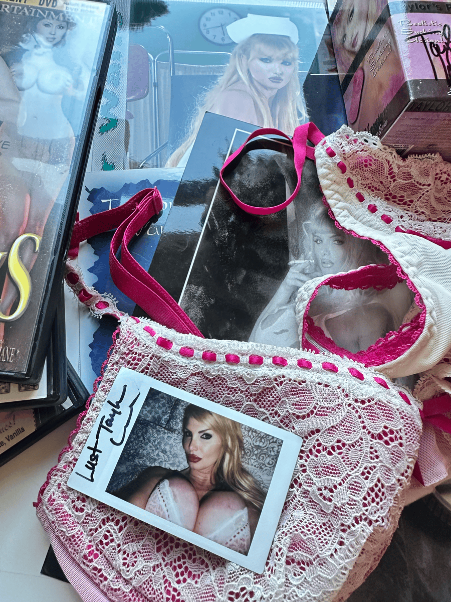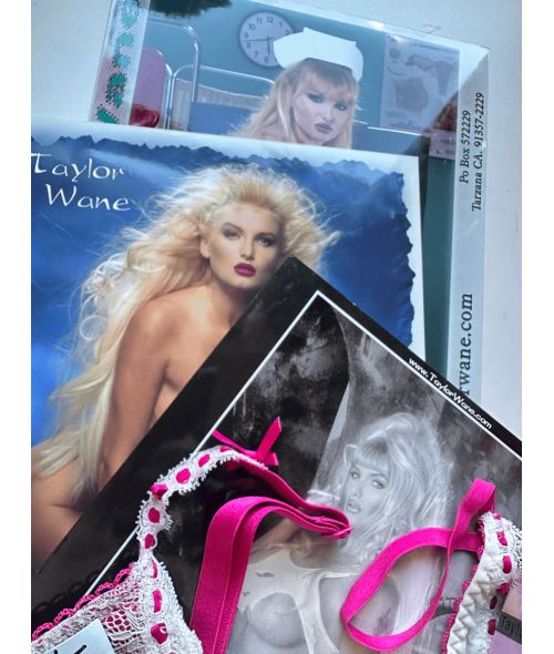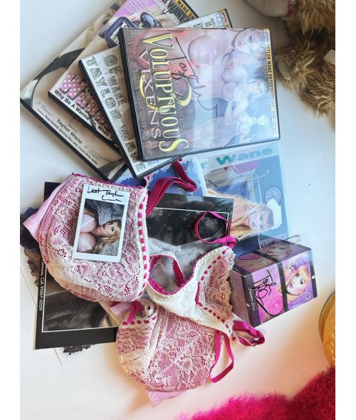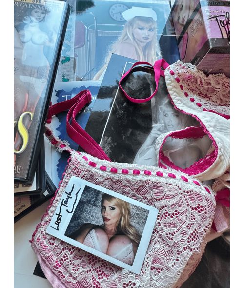 Gorgeous off white bra 36DD, with pink detail and trim. Matching thong, Comes with an extra bonus!! 4 DVDs, 3 8 x 10 photos, 1 polaroid of me wearing the bra, and a Taylor Wane masturbator.