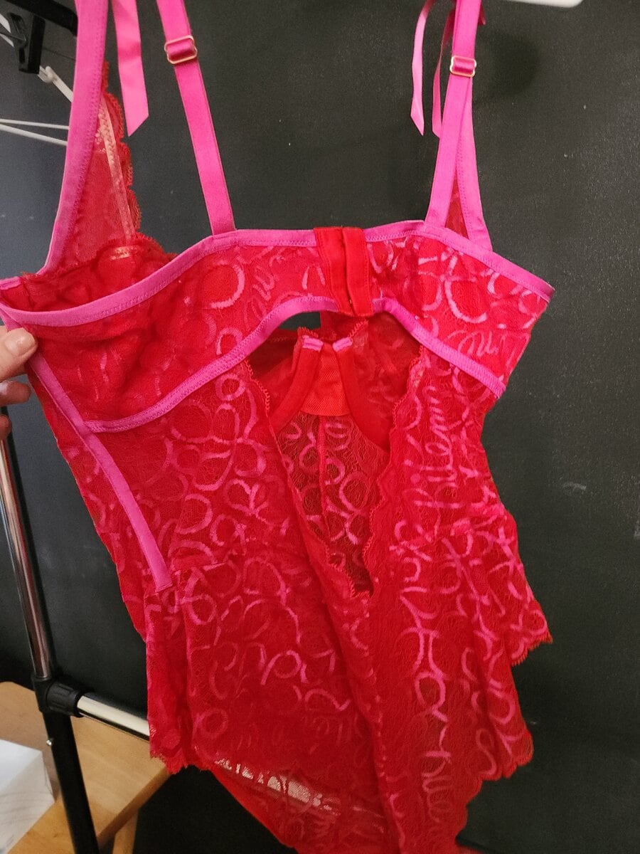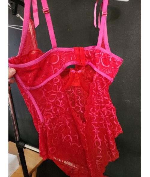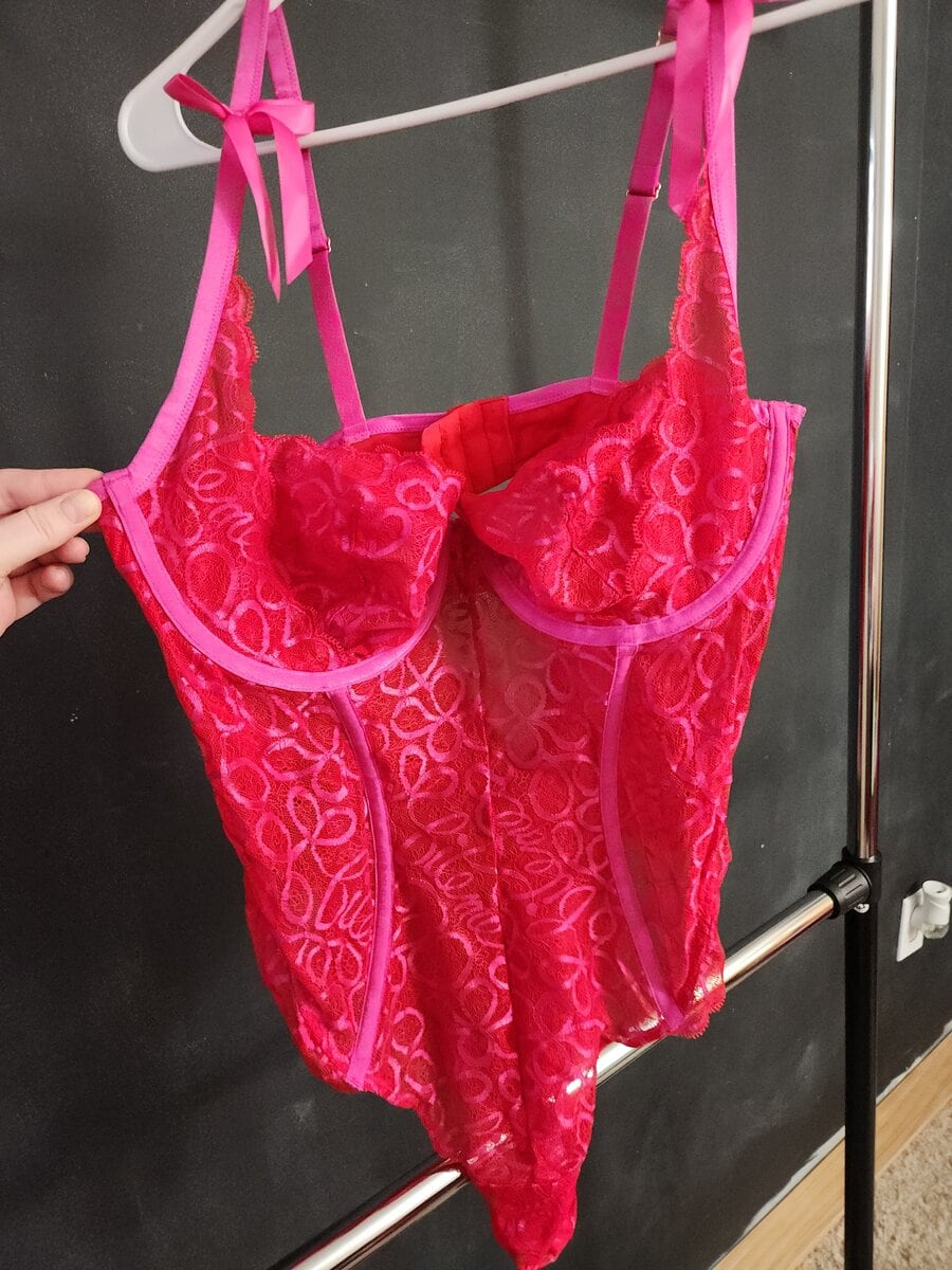 A pink lace one piece teddy worn by Lilli