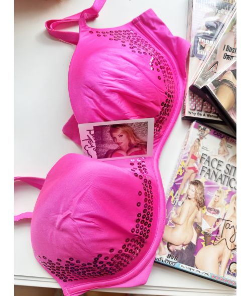 Gorgeous Pink pushup bra with sequin trim, 36DD. As a bonus im adding 4 DVDS, 3 - 5x7 color photos, and a polaroid of me wearing the bra.
