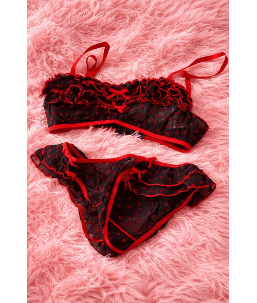 This Small-Medium lingerie set, crafted from luxurious sheer mesh, offers a soft and comfortable fit that hugs your curves just right. With playful tiny red heart prints scattered across the black mesh, and accented by vibrant red satin trims, it’s designed to tease and tantalize. The ruffled edges and satin bow details add the perfect touch of flirtation.
