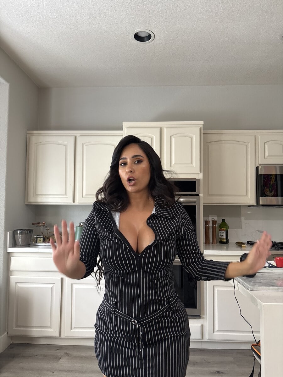Reena Sky black and white pinstripe suit w/ Fenty bra & panties