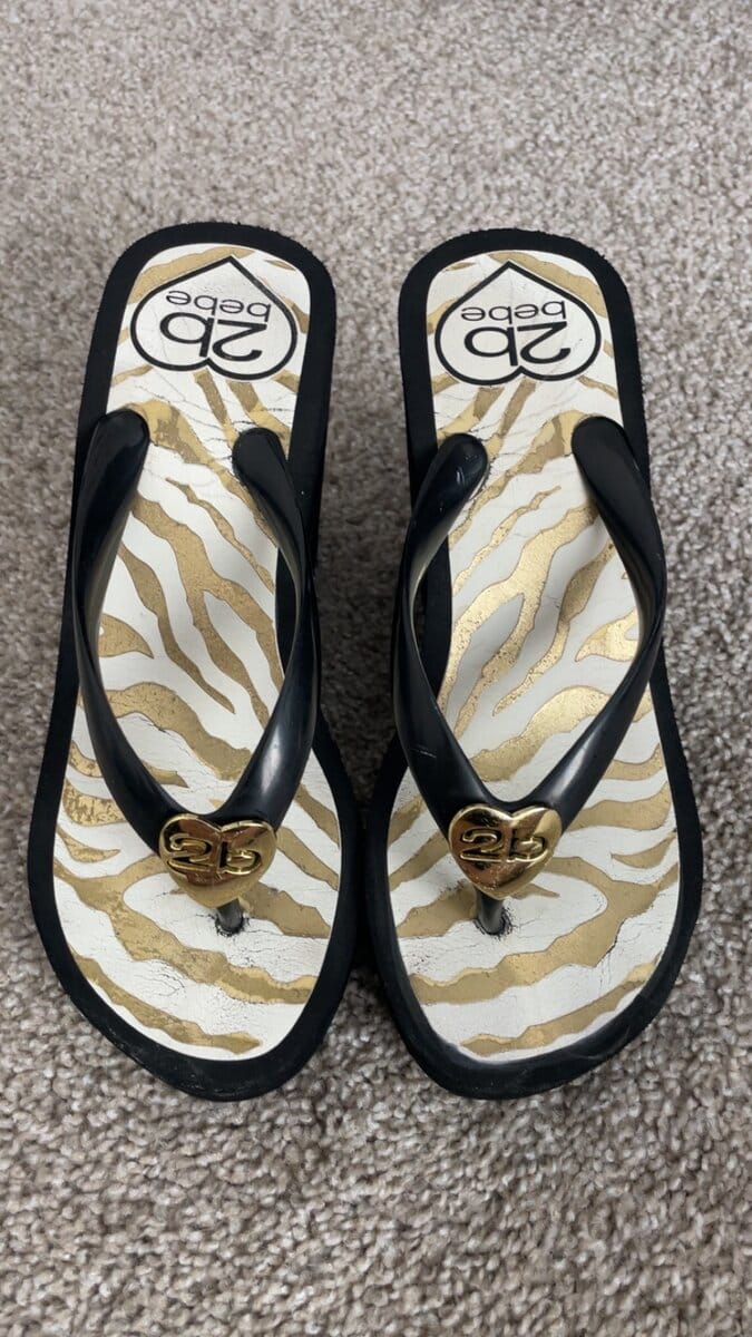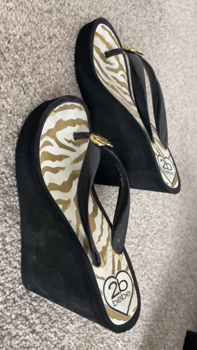 This listing is for Roxie Rae's worn, size 5 (US), bebe brand, wedge style flip flops/sandals. Flip flops were worn by Roxie in clips on www.iwantroxie.com and in personal life. Shoes are bagged and sealed after worn and bag is signed by Roxie. I will sign shoes upon request at time of purchase. Buyer pays shipping. Happy Shopping! xoxo