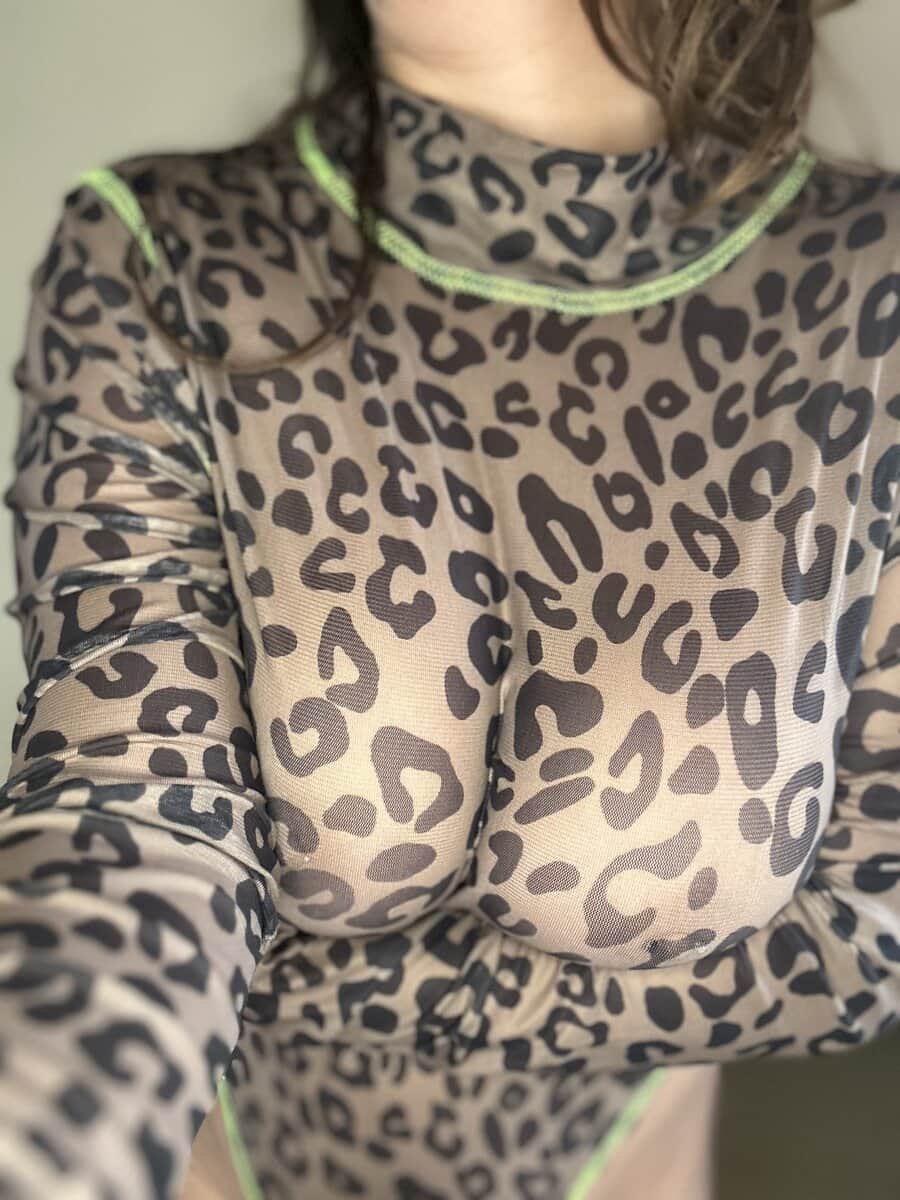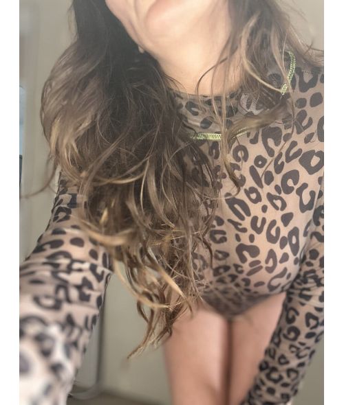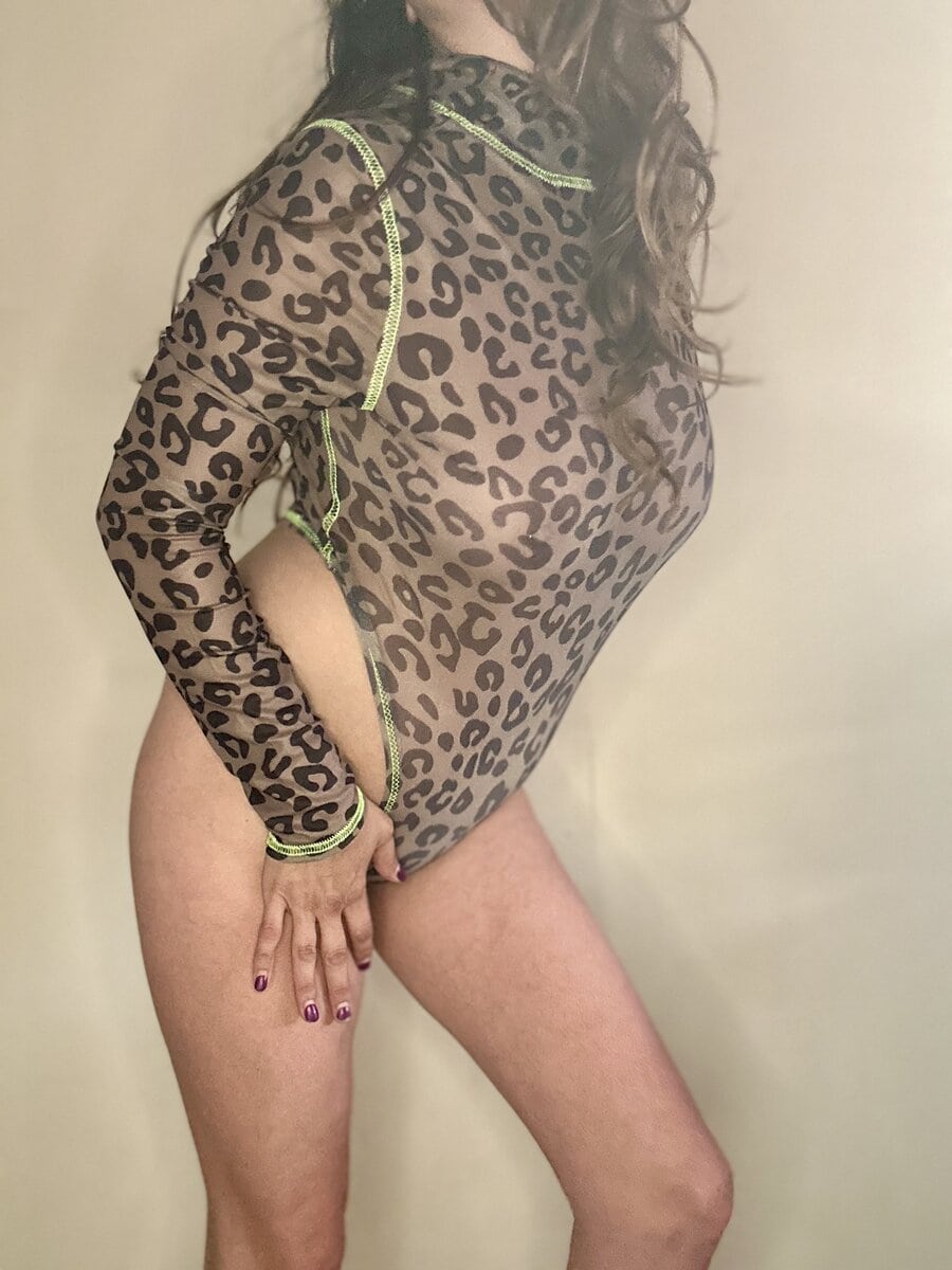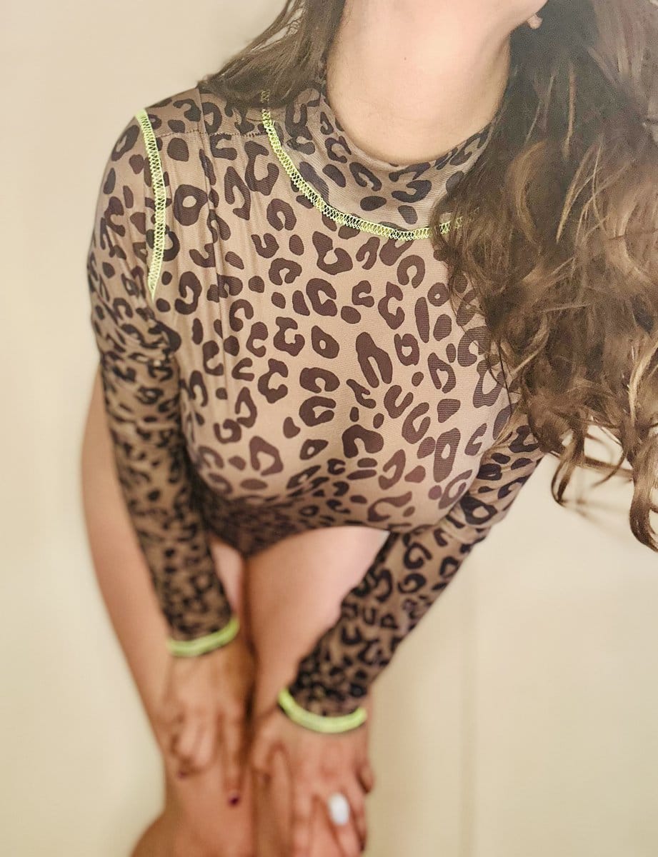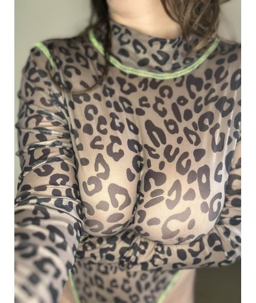 Sultry leopard one piece body suit. Dive right into this second skin body suit. This shear black mesh leave nothing to the imagination. With high cut legs framing the hips like danger signs. Snaps at the crotch for easy access. Still holding the warmth and essence from between my thighs.