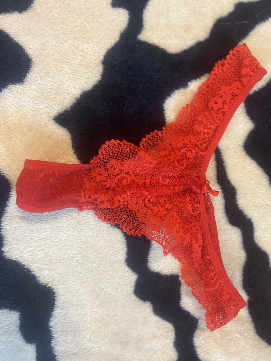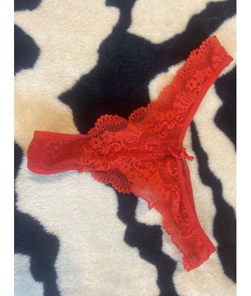 Slide yourself into this wet, little red lace thong, and let it all go. Available extra wet.