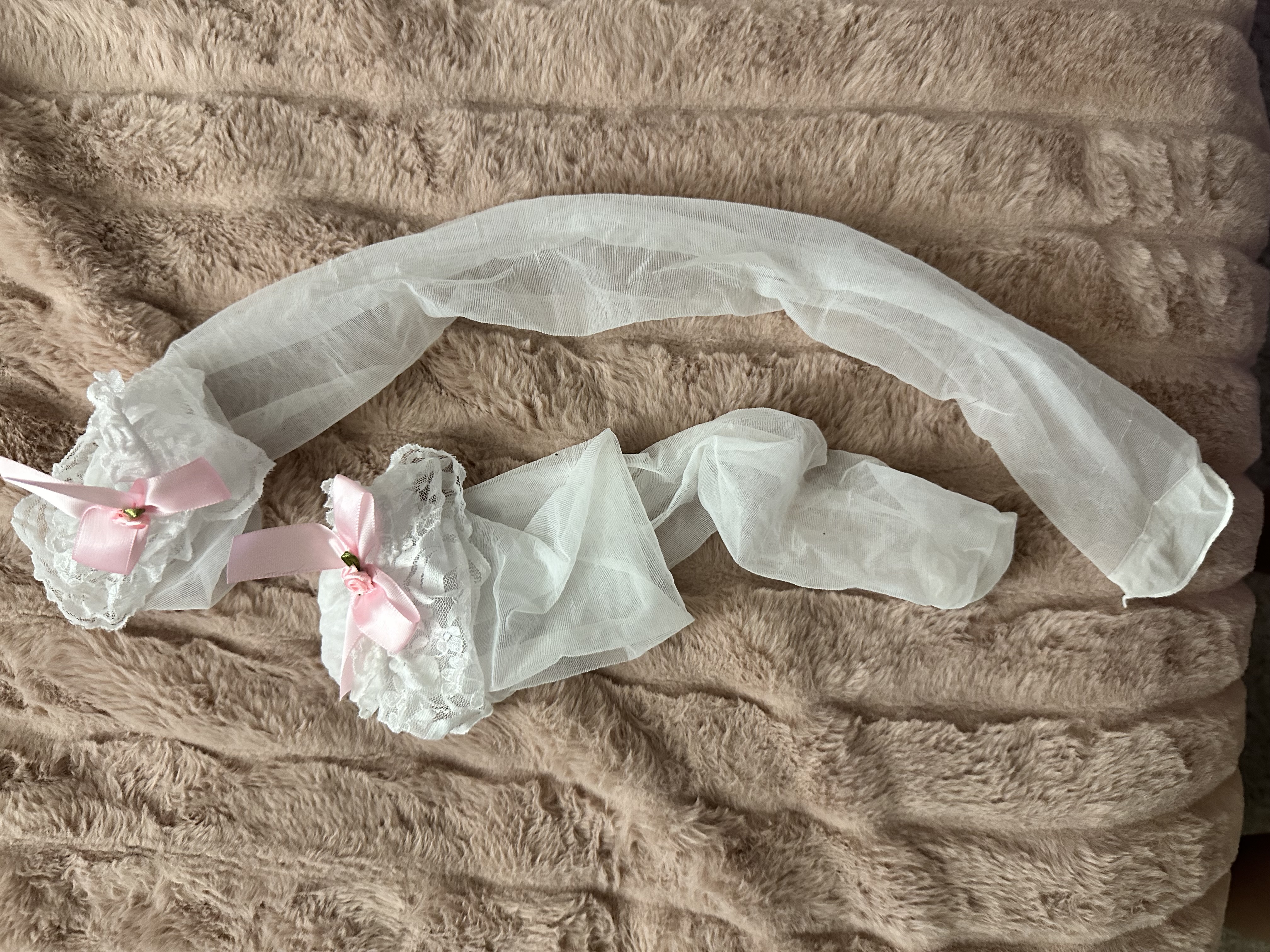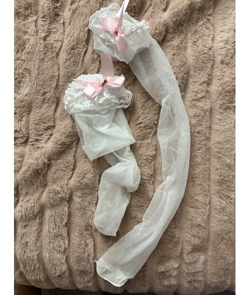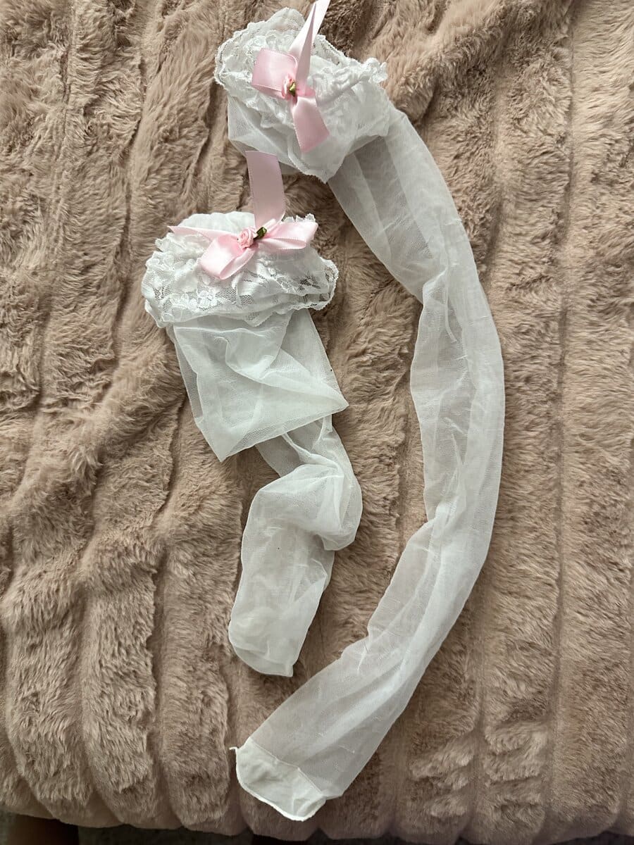 Cute and soft with a nice soft lace on the thigh with a cute pink little bow. One of my favorites for my feet...you can really feel everything through these little tights
