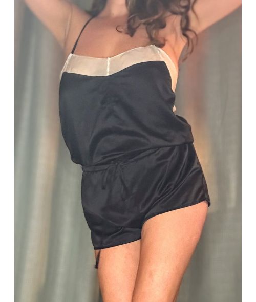 Dive into a world of tantalizing allure with this irresistible one-piece silky pajama nighty! This sultry gem, kissed by soft, whisper-thin silk. Well worn, it carries the electric thrill of late-night secrets—delicate spaghetti straps and a teasingly low neckline.
