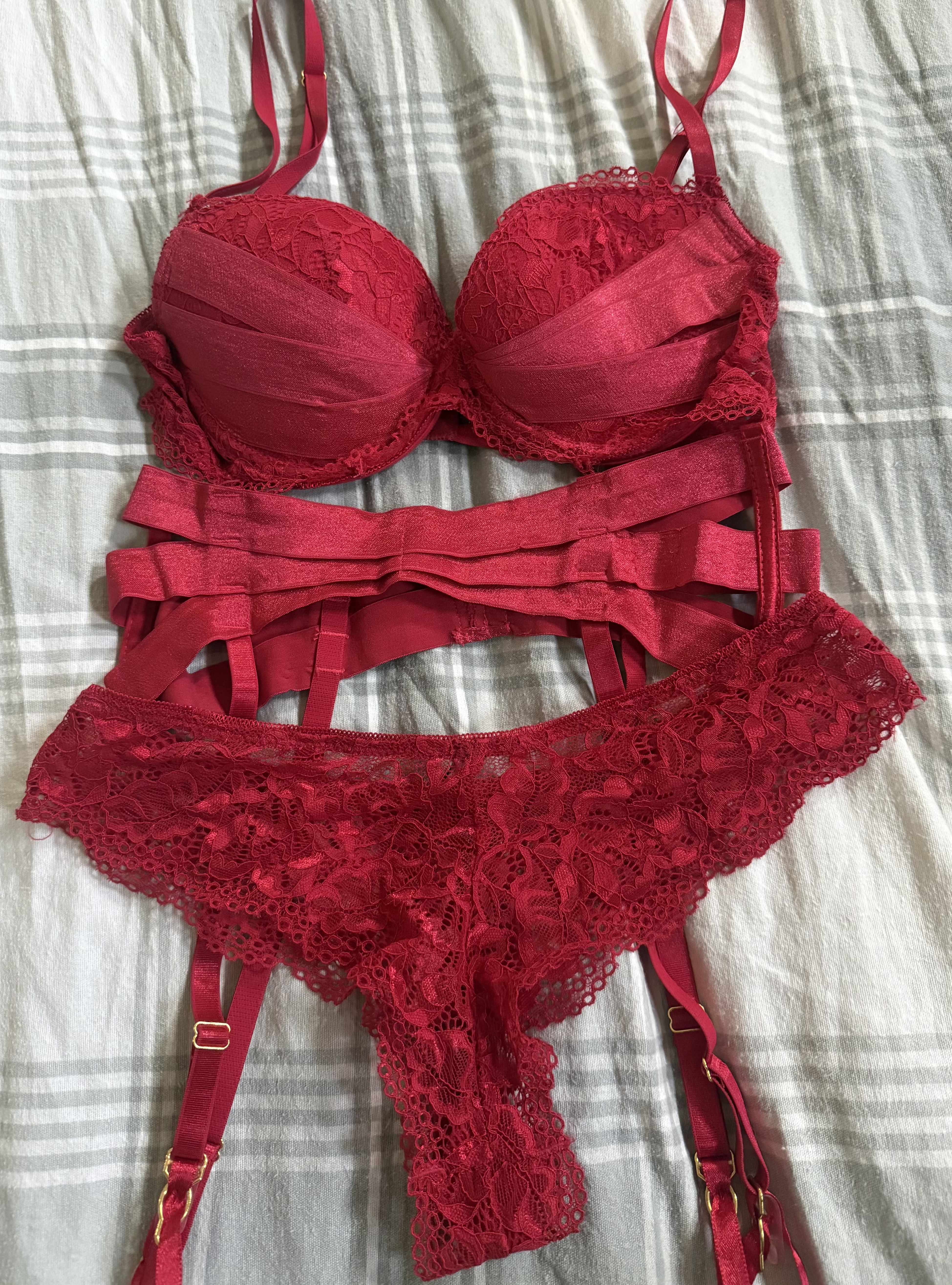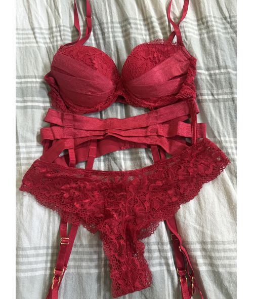 Sofie’s red worn lingerie set (bra, garter, cheeky panties)