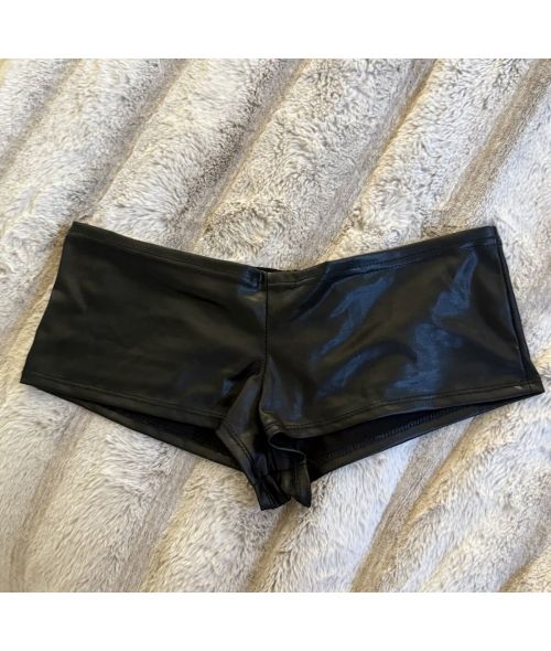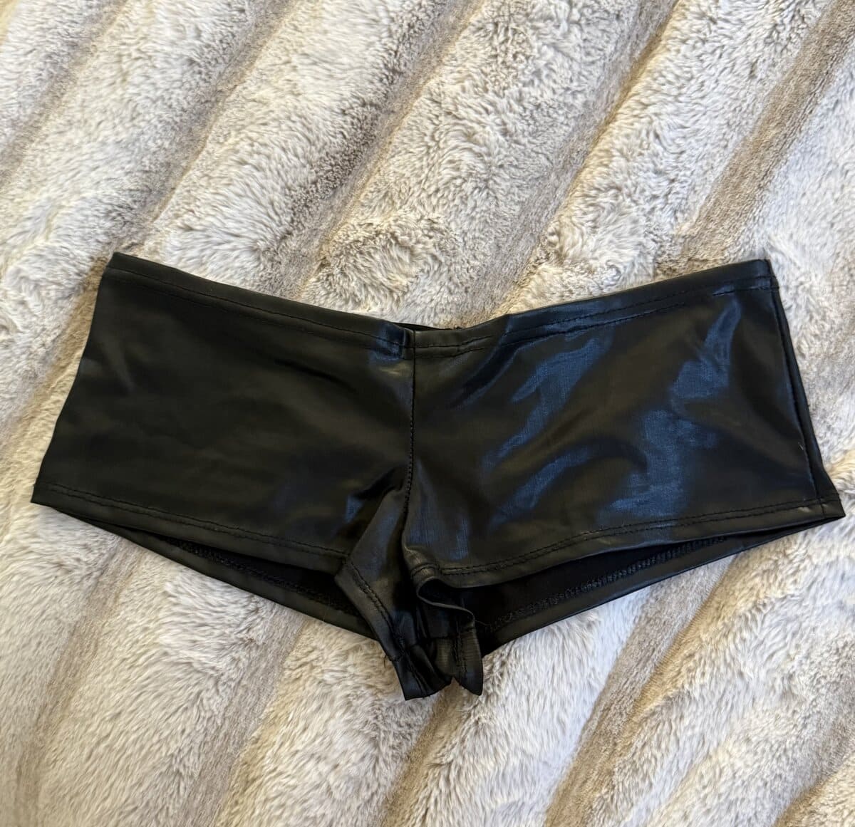 Sofie’s worn black pleather “hot pants” AKA booty shorts