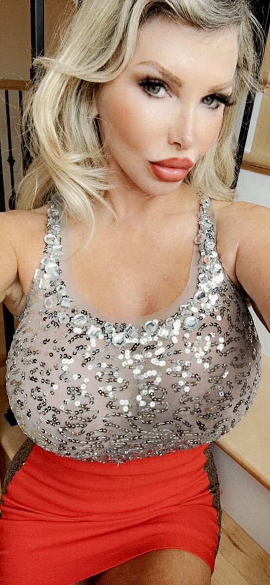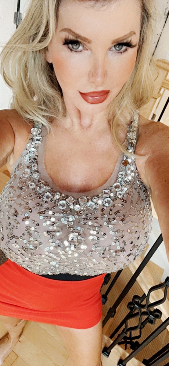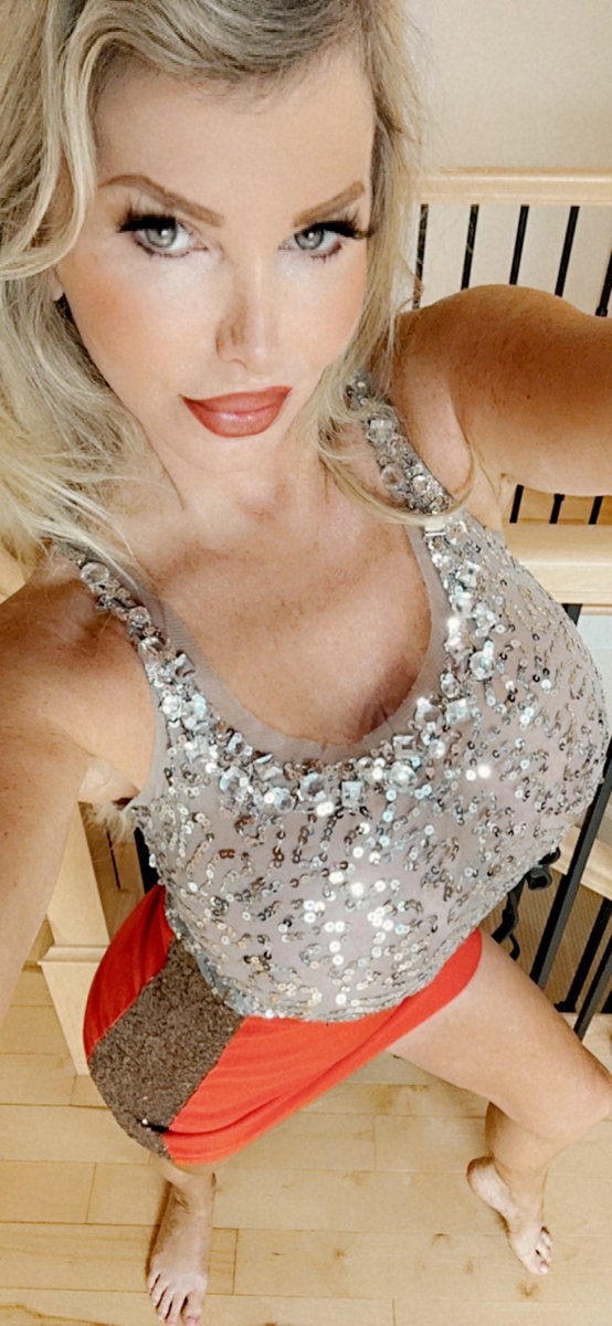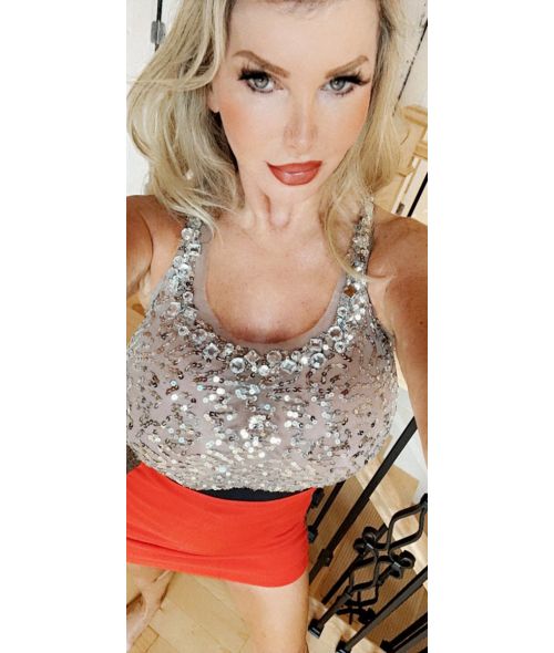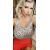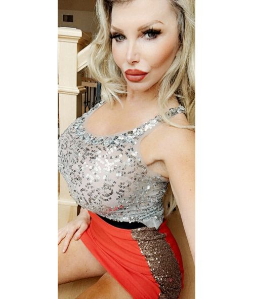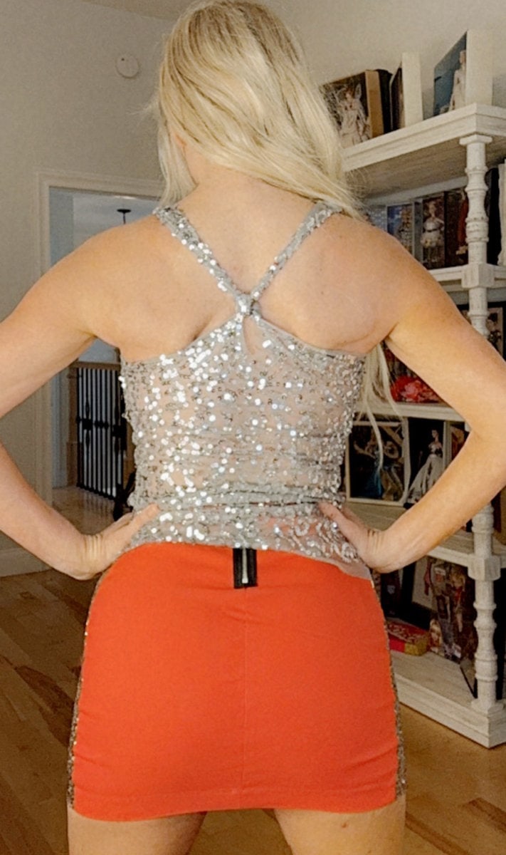 Super sexy see through sequin silver top, with red tight mini skirt with gold sequin stripe up sides. Zipper in back of skirt. Worn in shoots. Size small. Top and skirt is a little stretchy.