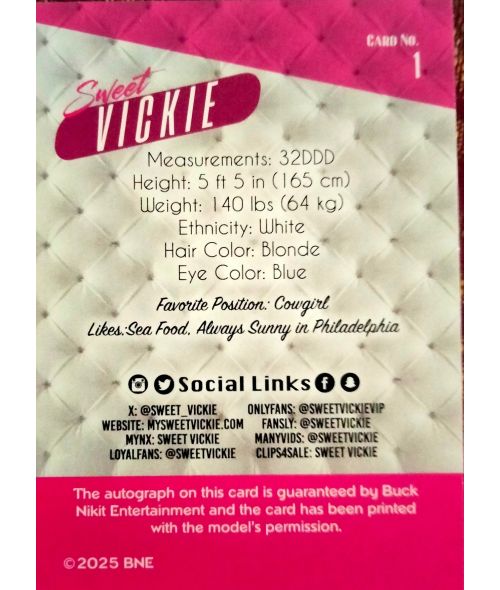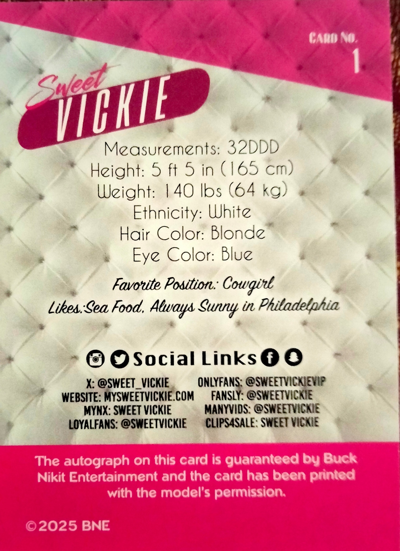 Listing is for a trading card signed by SWEET VICKIE. The COA on the back is guaranteed by Buck Nikit Ent (me) and SWEET VICKIE granted permission for these cards to be produced.