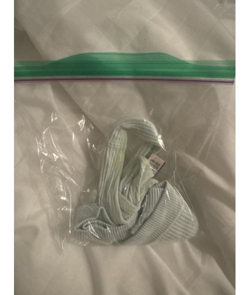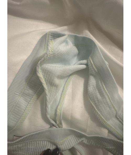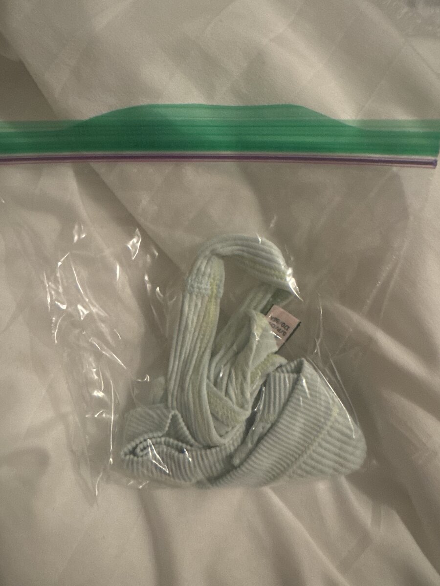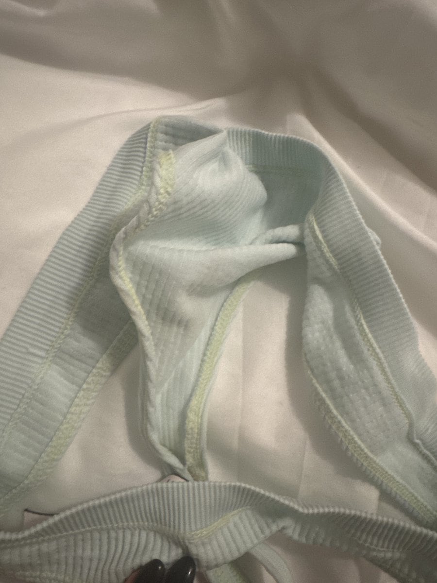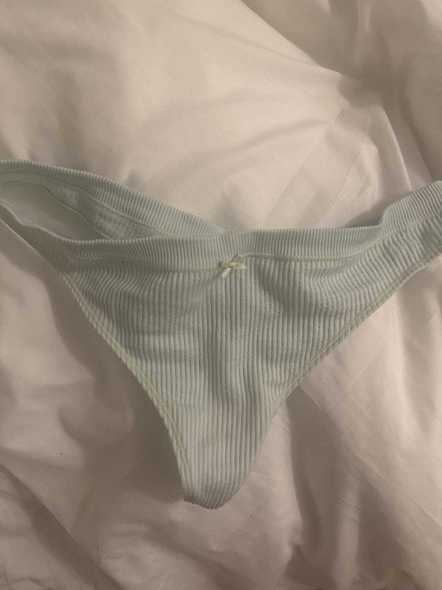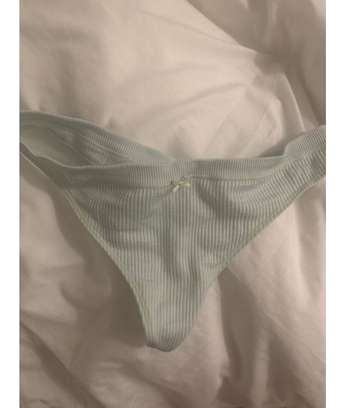 Very worn green thong with a stain! Thong fitted me small and uncomfortable so you get the smell of both my holes lol. Thong is a size small.