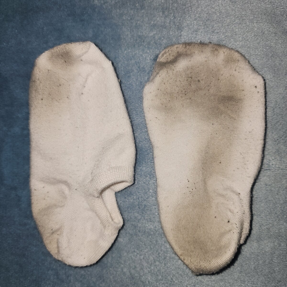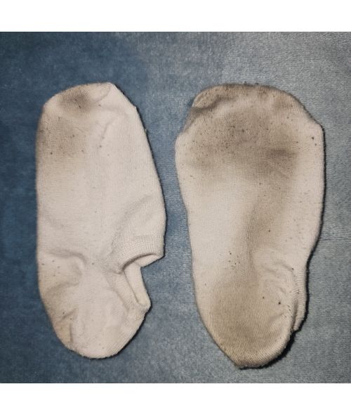 These little white socks are so soft, and my feet have already left their imprint in the soles.