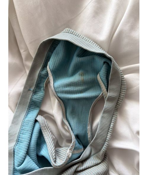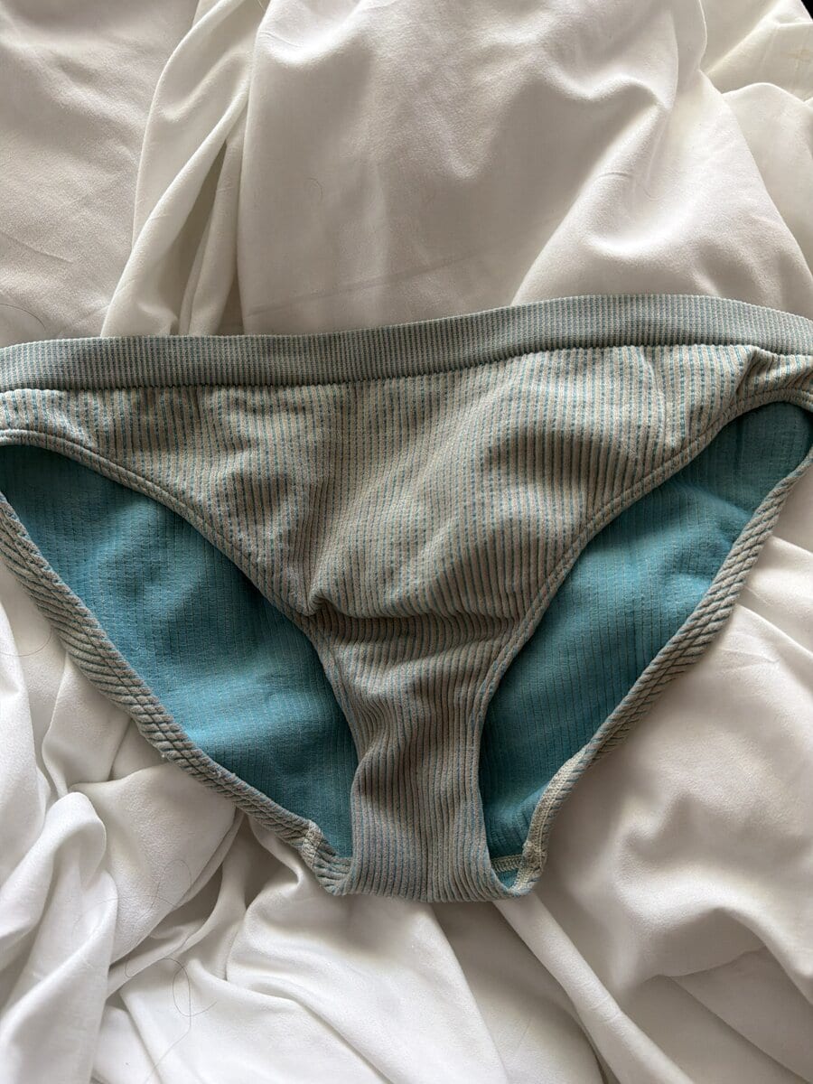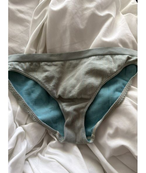 Worn green panties with a small cum stain. The panties are size S. I’ve had these panties for a long time and time to let them go.