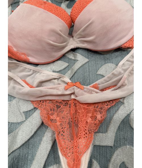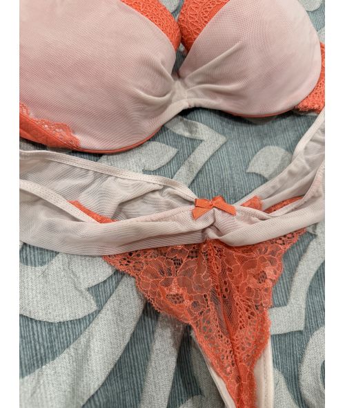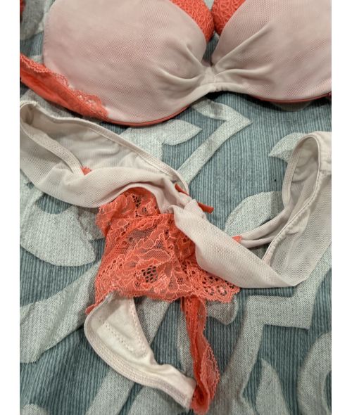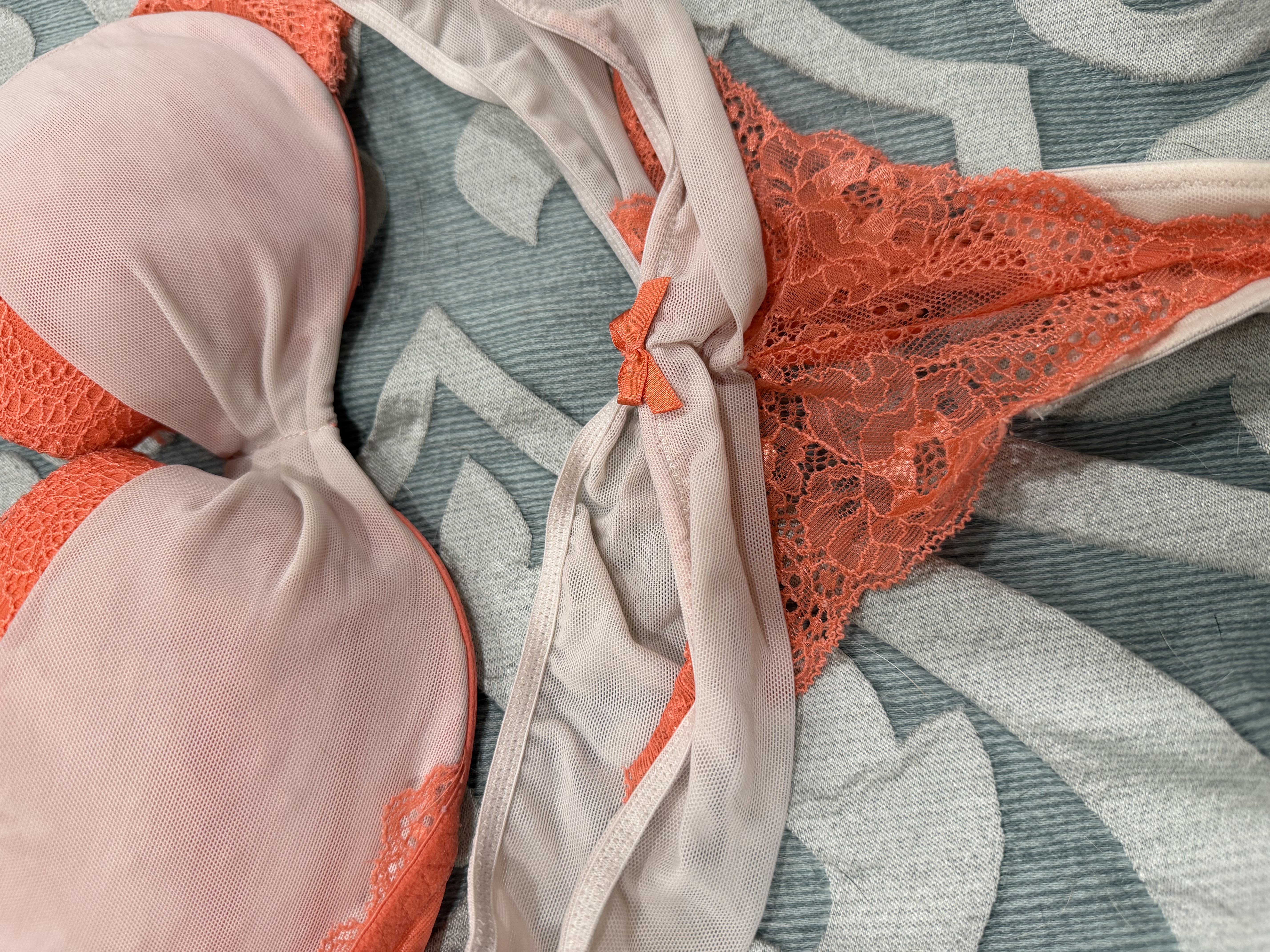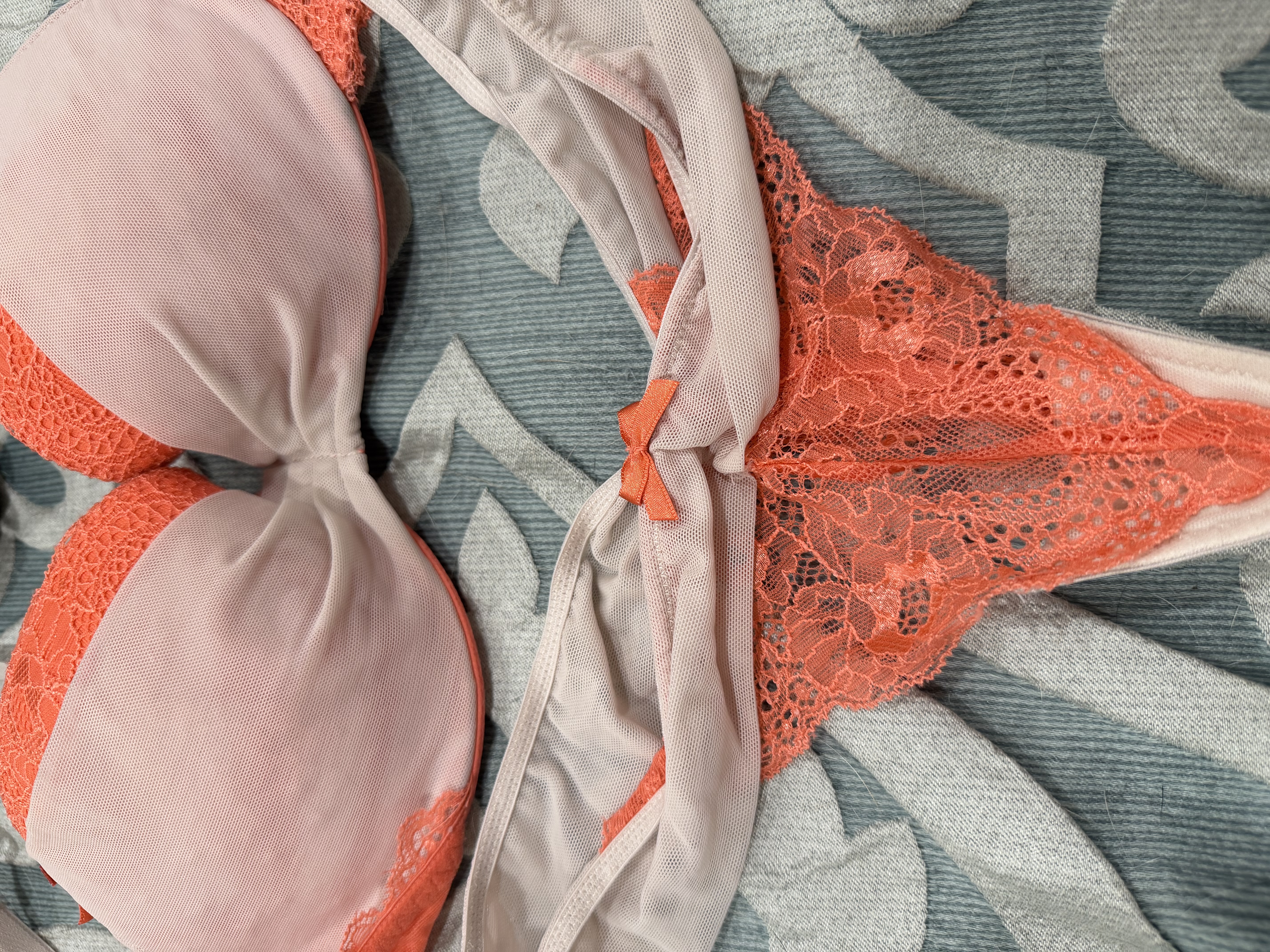 Sexy bright orange lace bra and matching panties, freshly worn by me. Soft, delicate lace that hugged my curves all day, with my natural scent still on them. Perfect for you horny guys who love real worn lingerie. Sniff, stroke, and enjoy – these are straight from my body to yours.