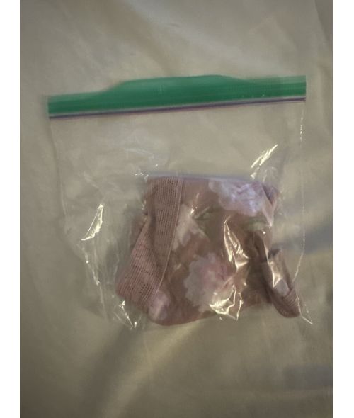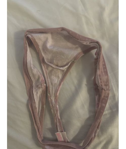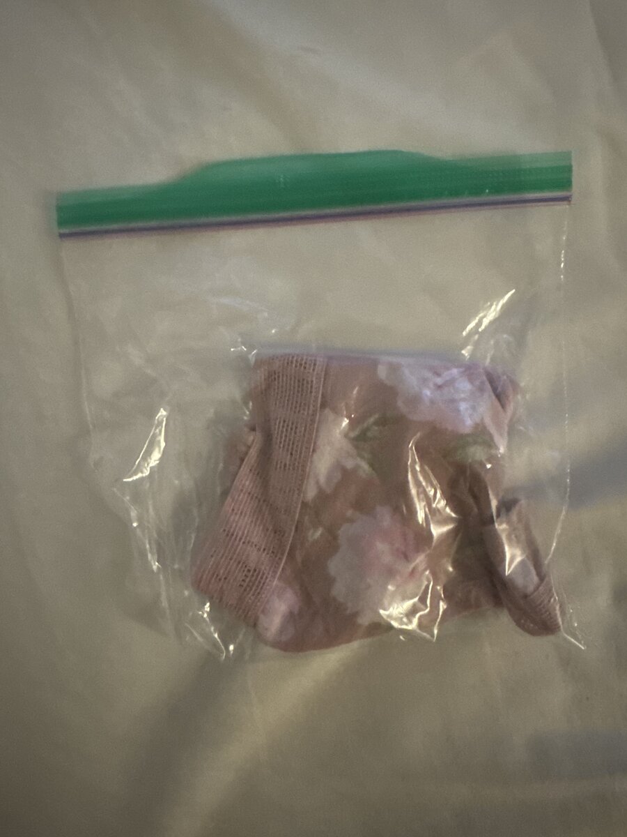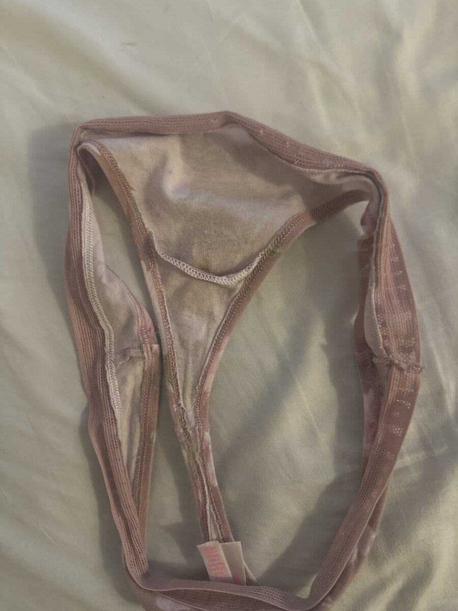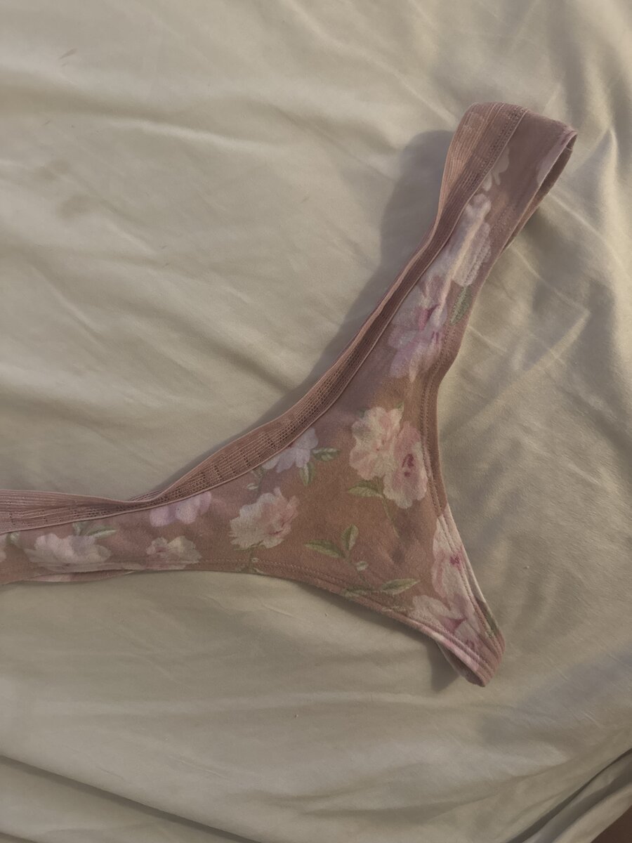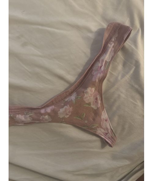 Worn pink floral thong. The thong fit me so tight that it does have my strong scent on them, get them before they’re gone. Thong is a size small.